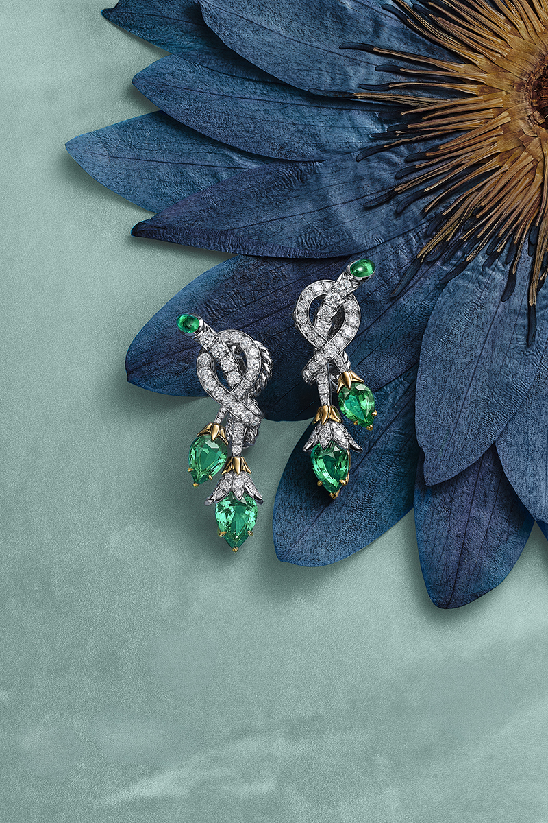 Ở phiên bản emerald, các viên đá hình giọt lê và cabochon được tuyển chọn hoàn hảo, kết hợp cùng kim cương và điểm nhấn vàng 18k, tạo chiều sâu và kết cấu. Trong khi đó, phiên bản kim cương sử dụng những đường cong mềm mại ôm theo cơ thể, kết thúc bằng các viên kim cương giọt lê.