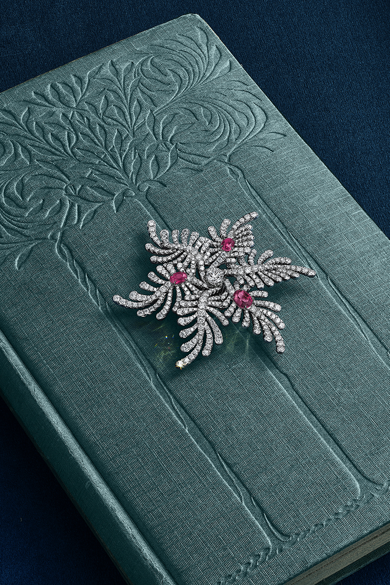 Khép lại chương Xuân, Palm tái hiện những chiếc lá xoắn mềm mại, hé lộ các viên ruby oval không xử lý từ Mozambique, nổi bật với sắc đỏ rực rỡ và độ phát quang mạnh mẽ, minh chứng cho di sản tuyển chọn đá quý hoàn hảo của Tiffany.