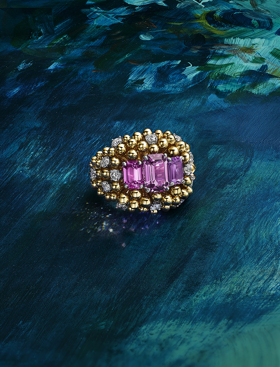 Bloom ghi lại khoảnh khắc nụ hoa sắp nở với sapphire hồng tím và kim cương, được chế tác hoàn toàn bằng vàng 18k, điểm nhấn khác biệt so với phần còn lại của bộ sưu tập chủ yếu sử dụng bạch kim.
