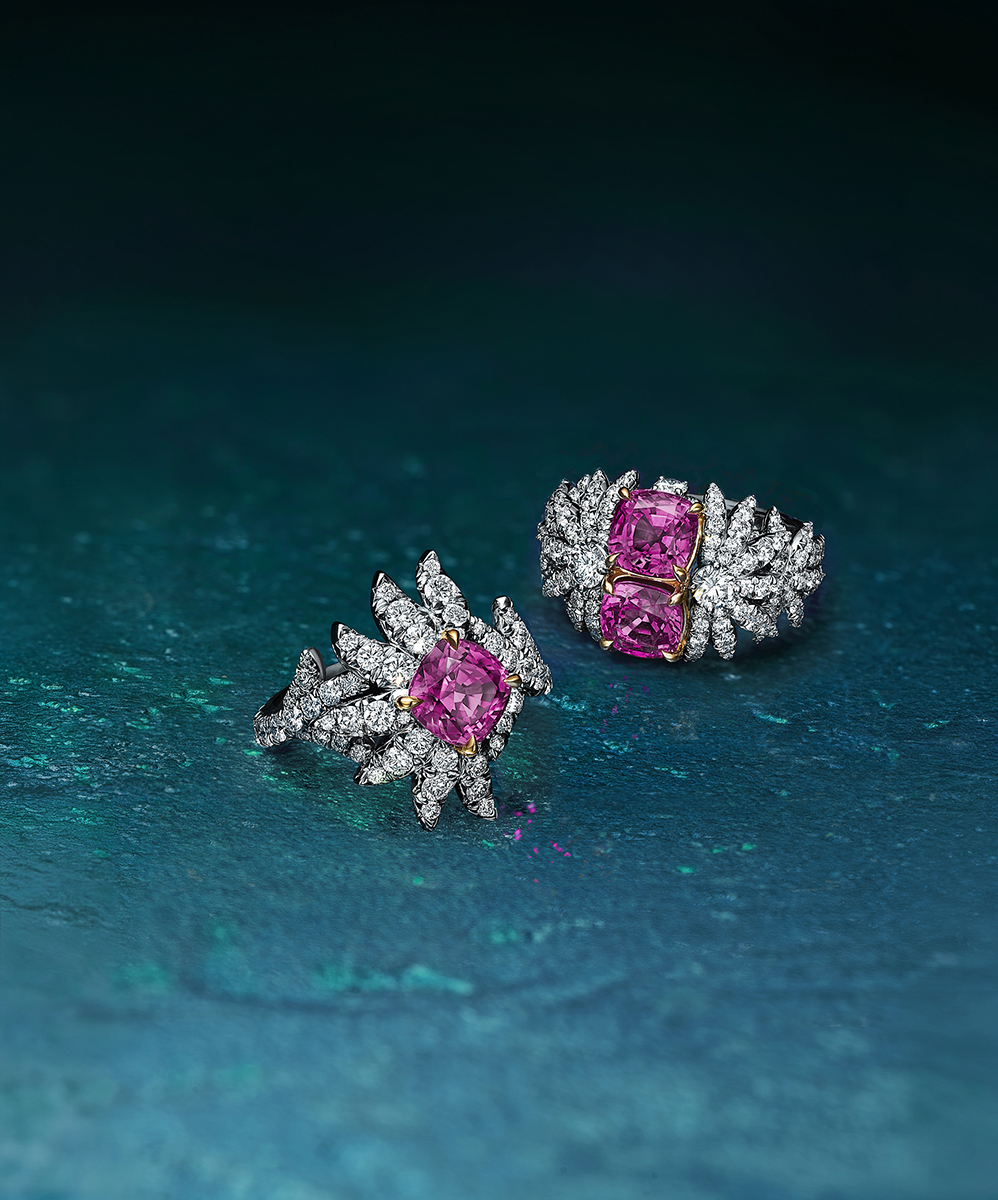 Marguerite diễn giải hoa cúc với hai phong cách: Một sử dụng sapphire hồng không xử lý, mang vẻ mềm mại rực rỡ; một sử dụng kim cương emerald-cut, phá vỡ cấu trúc truyền thống thông qua khoảng không âm đầy táo bạo.