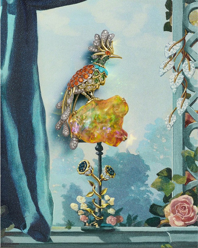 Paradise Bird tiếp nối câu chuyện về loài chim qua loạt trâm cài giàu tính tưởng tượng, tôn vinh màu sắc và tự do sáng tạo. Mỗi thiết kế là hình ảnh một chú chim kỳ ảo đậu trên viên đá quý nổi bật – opal lửa Mexico, rubellite Brazil, chalcedony xanh Ethiopia hoặc spessartine Madagascar được lựa chọn vì sắc màu sống động và cá tính mạnh mẽ.