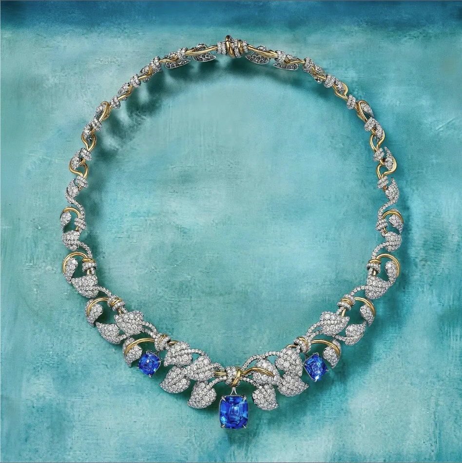 Ẩn mình trong những tán lá là các viên sapphire cushion không xử lý đến từ Sri Lanka và Madagascar, được tuyển chọn đồng nhất. Song song đó, họa tiết lá trở thành nền tảng cho những sáng tạo kim cương ấn tượng, nổi bật với đôi hoa tai sử dụng kim cương emerald-cut loại D, hoàn mỹ nội tại, tổng trọng lượng trên 10 carat. Sự kết hợp hai kim loại trong thiết kế phản ánh di sản đặc trưng của Tiffany trong việc hòa quyện bạch kim và vàng.