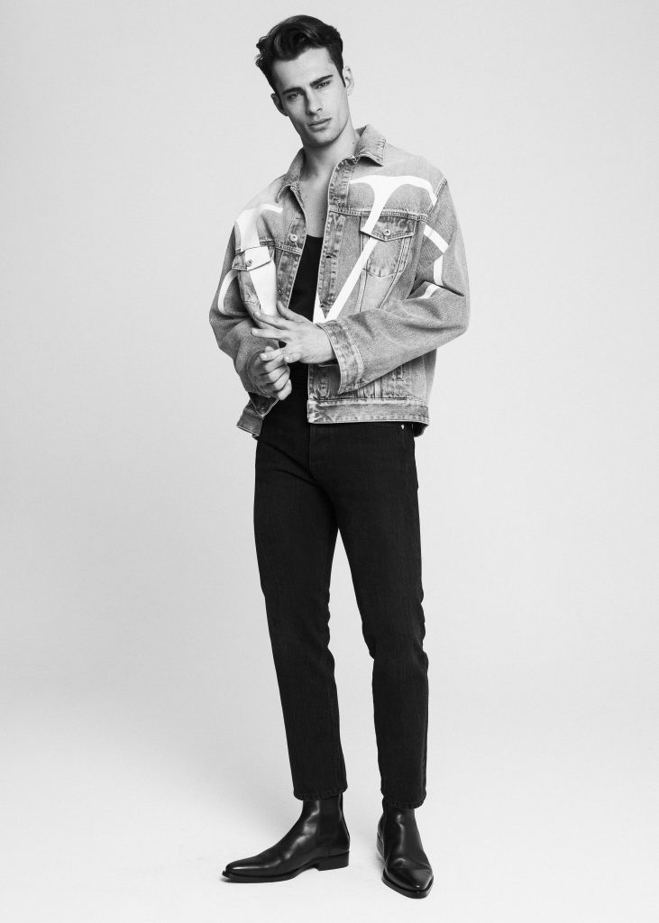 Valentino Denim jacket; áo ba lỗ Lanvin Jersey; quần jeans Versace; giày da cổ cao Givenchy Calf