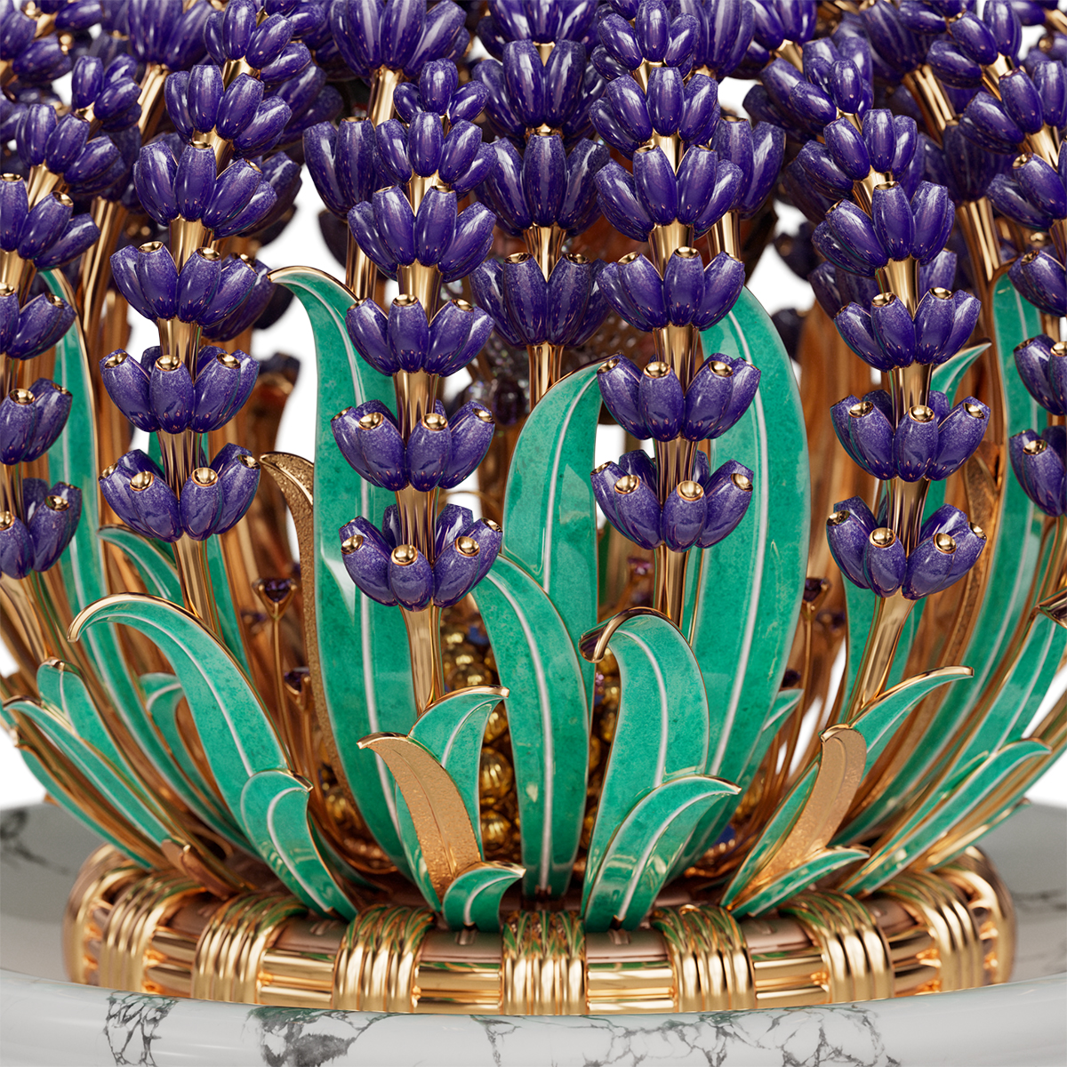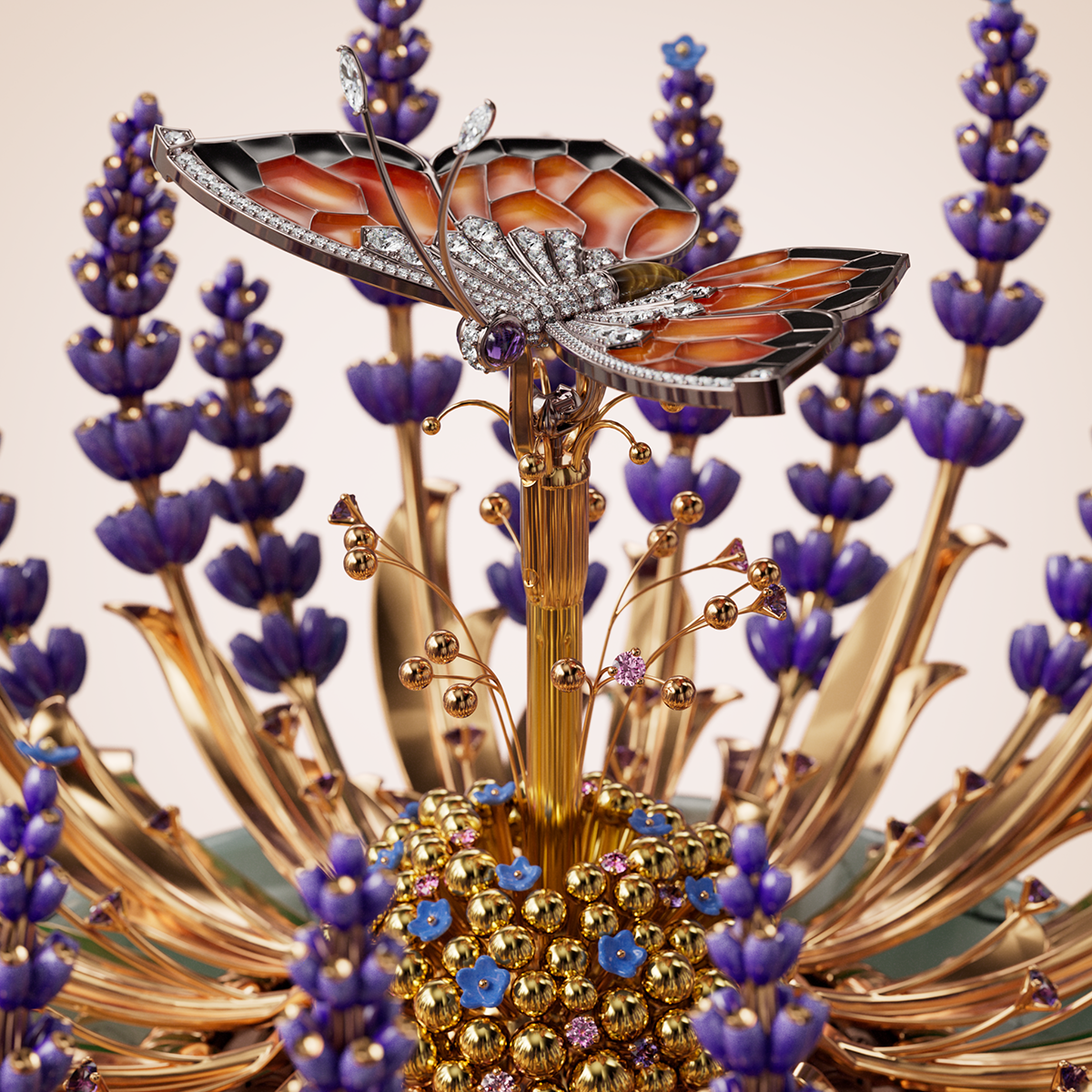 Nhưng vẻ đẹp thực sự của tạo tác này nằm ở khoảnh khắc nó được đánh thức. Khi cơ chế automaton được kích hoạt, một bản nhạc carillon du dương cất lên. Bó oải hương bắt đầu chuyển mình như đang lay động bởi một làn gió nhẹ, 36 cành hoa bắt đầu từ từ hé nở. “Bí mật” được cất giấu bên trong giờ đây đã lộ diện: Một cánh bướm tuyệt đẹp bay lên trong một vũ điệu xoay tròn mê hoặc. Đây là nơi đỉnh cao của métiers d’art. Đôi cánh bướm này không phải là một khối đặc.