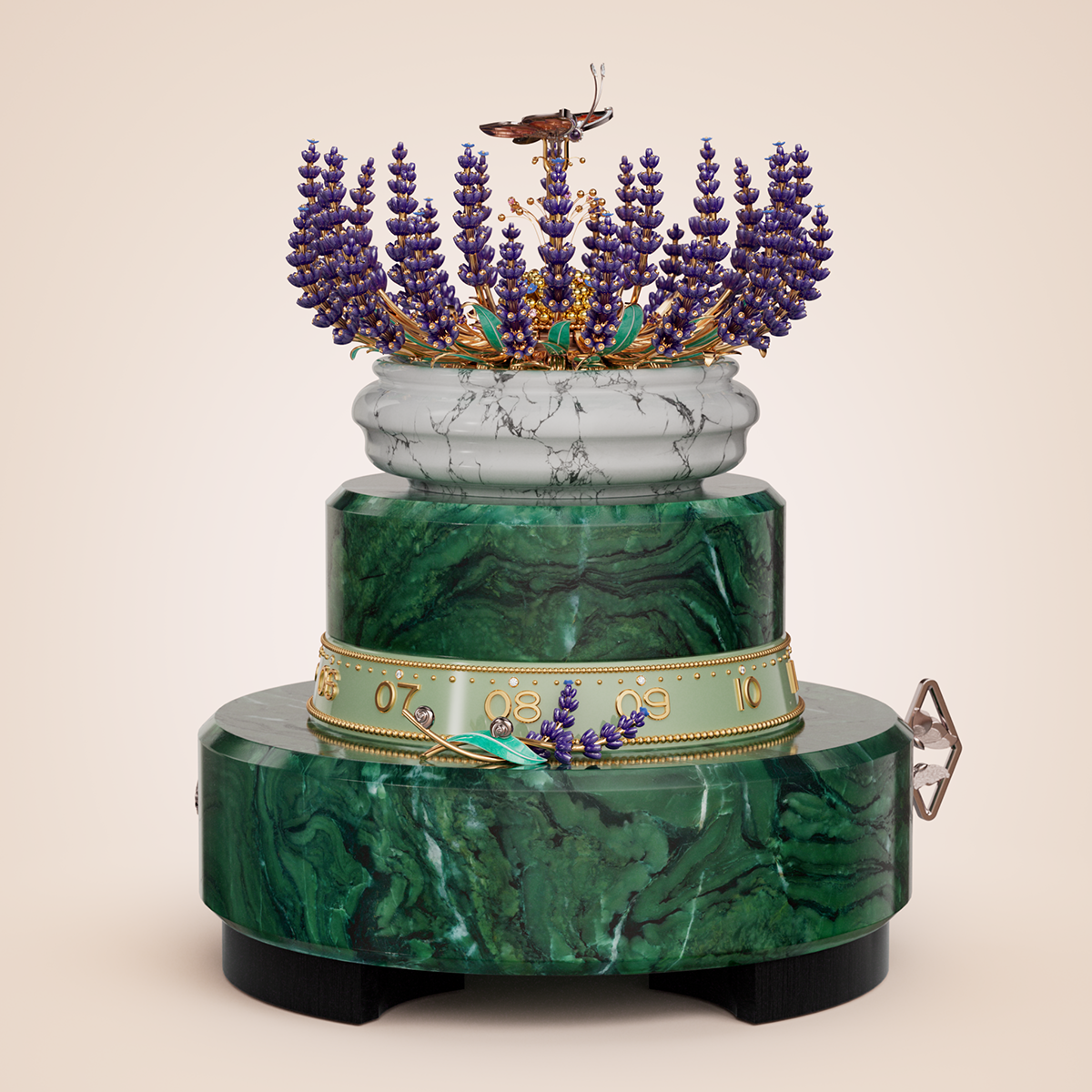 Để tạo ra phép màu này, các nghệ nhân tại Mécanique d’Art ở Sainte-Croix đã mất nhiều năm nghiên cứu. Tạo tác này sở hữu không chỉ một, mà là hai bộ máy cơ khí hoạt động độc lập, sở hữu mức dự trữ năng lượng lên đến 8 ngày. Bộ máy thứ nhất dành riêng cho cơ chế automaton, đảm nhận nhiệm vụ điều khiển sự nở hoa của bó oải hương và vũ điệu bay lượn của cánh bướm. Vô số thử nghiệm đã được tiến hành để đảm bảo chuyển động mềm mại như thật.