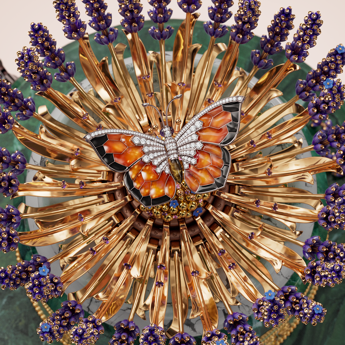 Các nghệ nhân đã sử dụng kỹ thuật tráng men Plique-à-jour giống như một cửa sổ kính màu trong nhà thờ, một cấu trúc khung bằng vàng trắng được đục rỗng, sau đó tỉ mỉ lấp đầy các bằng nhiều lớp men cam mờ, nung qua lửa nhiều lần để đạt được độ trong suốt hoàn hảo. Viền cánh được viền bằng men đen đục tạo nên sự tương phản sắc nét. Phần thân bướm được tạc từ đá mắt hổ, đôi mắt là hai viên thạch anh tím cabochon, và cặp râu được điểm xuyết kim cương. Sau khi bay lượn, cánh bướm lại tìm về nơi ẩn náu giữa một cụm hạt vàng nạm thạch anh tím, và bó hoa oải hương lại dịu dàng khép lại, niêm phong bí mật của mình.