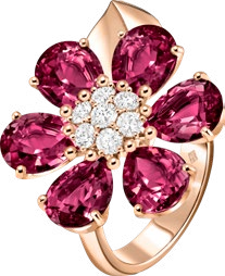 Những viên đá cắt hình giọt nước được kết hợp để tạo thành một đài hoa quý giá. Tựa như được nâng lên bởi một làn gió nhẹ, mỗi cánh hoa đều vươn mình, truyền vào tạo phẩm sự thanh thoát và nguồn sinh khí mạnh mẽ. Cấu trúc giá đỡ bằng vàng cũng được các nghệ nhân kim hoàn chế tác tỉ mỉ. Được hiện thực hóa thông qua kỹ thuật đúc mẫu chảy, kiến trúc openwork cho phép ánh sáng tự do xuyên qua các viên đá và tôn vinh sắc màu rực rỡ của chúng.