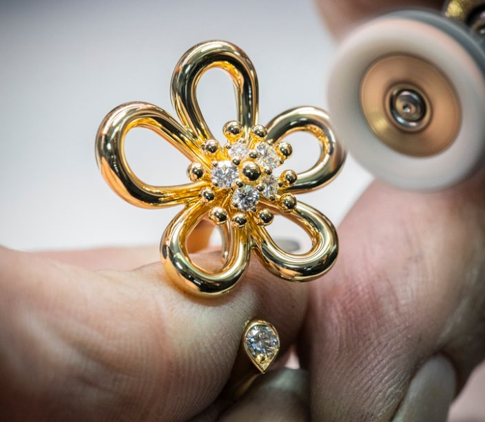 Những cánh hoa được uốn cong nhẹ nhàng nhằm mang lại độ phồng cho bố cục, trong khi nhụy hoa nổi bật với những hạt viền vàng và kim cương đa kích thước, tạo một cấu trúc bất đối xứng tinh tế lột tả ý niệm về một thiên nhiên luôn chuyển động. Kiến trúc của từng tạo phẩm và độ nổi của các đường cong khiến công đoạn đánh bóng thủ công trở nên đặc biệt khắt khe. Cần đến sự chuẩn xác tuyệt đối và lòng kiên nhẫn để đánh thức trọn vẹn vẻ rạng rỡ của vàng kim, tương tác cùng sự lấp lánh của kim cương tạo nên những vệt sáng lấp lánh đầy mị lực.