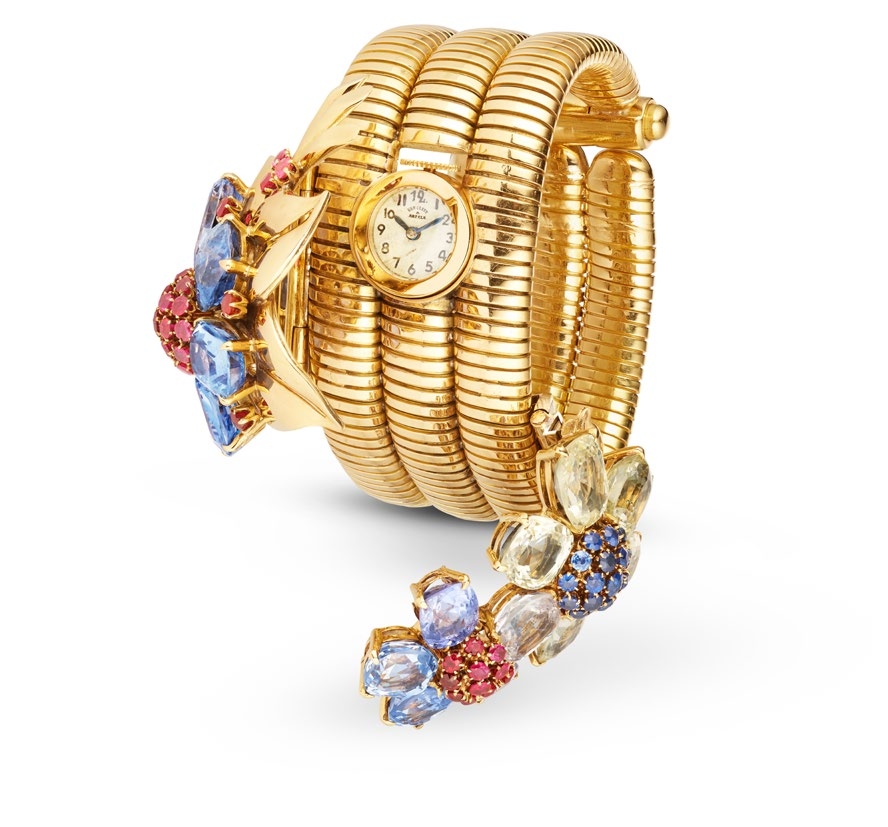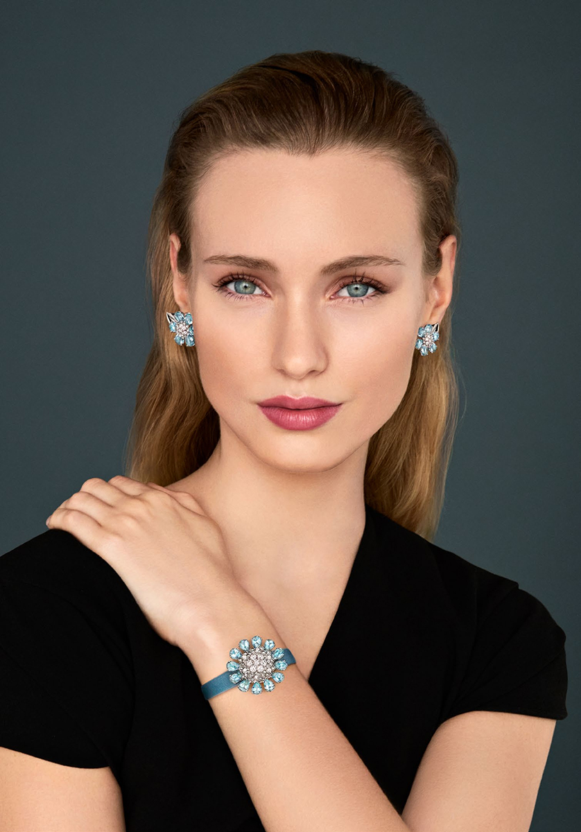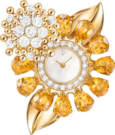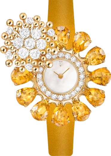 Đóa hoa có thể được tháo rời theo ý muốn và diện như một chiếc vòng tay, trâm cài hoặc mặt dây chuyền. Món “trang sức báo giờ” này trân quý và nâng niu cổ tay phái đẹp bằng một màn giao thoa màu sắc quý giá giữa citrine và vàng kim, rhodolite và vàng hồng, aquamarine và vàng trắng – sự kết hợp này còn được tiếp nối trên chiếc dây đeo lụa satin đồng hành cùng mỗi tuyệt tác.