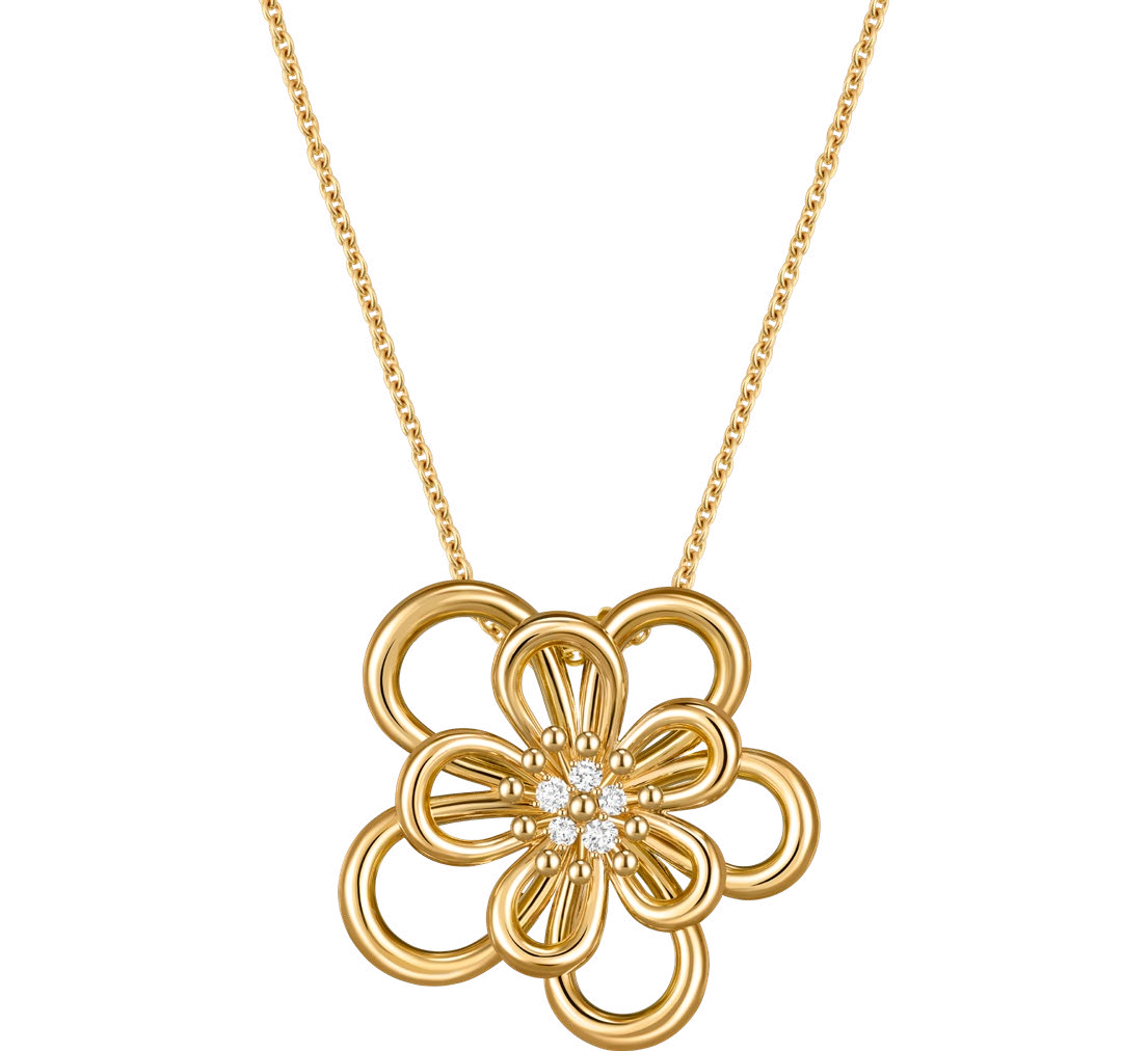 Những cánh hoa tỏa sáng rực rỡ, tựa như đang đắm mình trong ánh dương. Các đường nét kiến tạo nên một đóa hoa tròn trịa đầy thanh tao khơi gợi sự uyển chuyển của một dải ruy băng, minh chứng cho một chủ đề mang tính biểu tượng khác của Van Cleef & Arpels: Thời trang cao cấp.