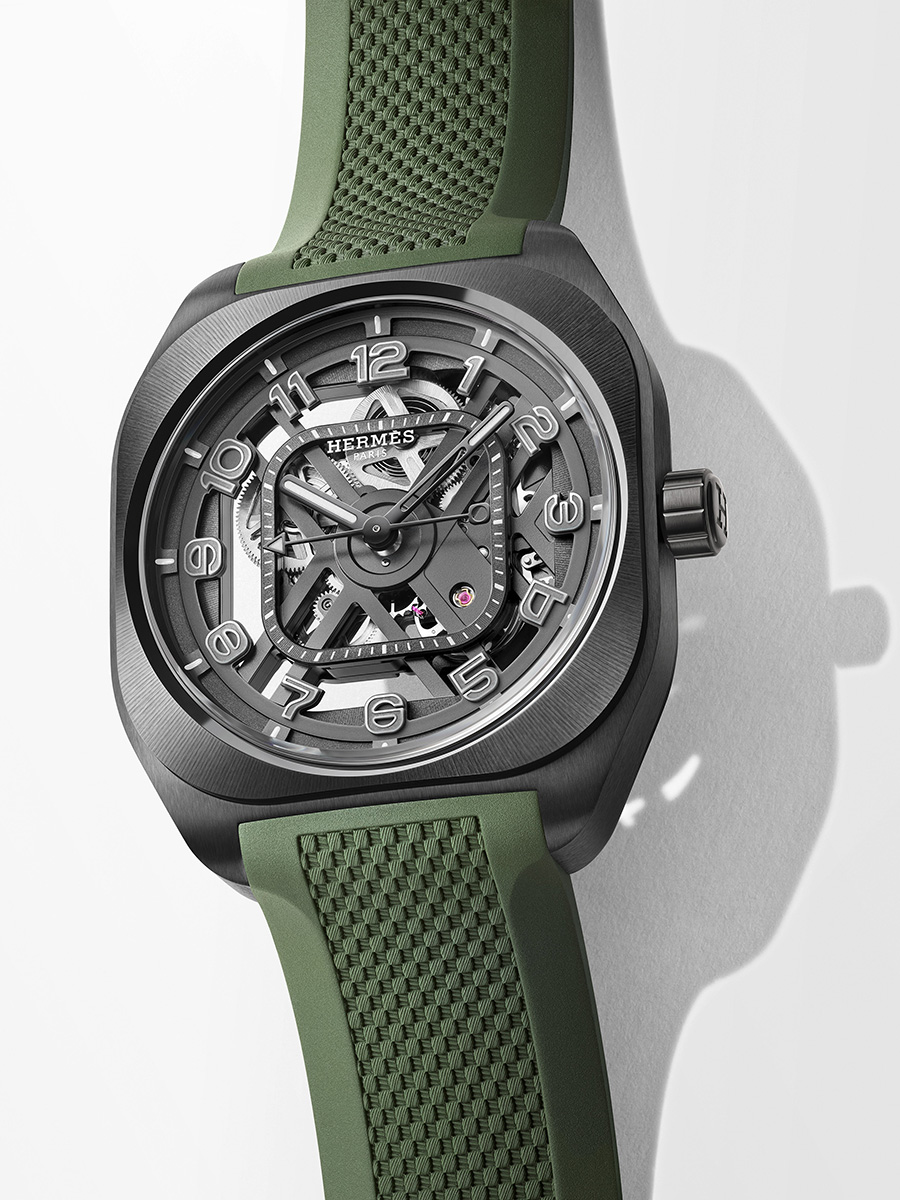 Những đường nét thanh mảnh và hệ thống bánh răng hướng ánh nhìn vào trung tâm của bộ máy titan lộ cơ Hermès H1978 S mới. Các linh kiện đan xen và chồng lớp lên nhau, dẫn mắt nhìn xuyên qua cấu trúc vật lý của thời gian. Mẫu Hermès H08 Squelette đi kèm dây đeo cao su có cấu trúc vân dệt, đồng điệu với các sắc thái riêng biệt của từng mẫu trong số hai phiên bản. Ở phiên bản màu xanh, các cọc số giờ bằng Super-LumiNova® màu xanh giúp tăng cường hiệu ứng tương phản, làm nổi bật mạnh mẽ mặt số của thiết kế.