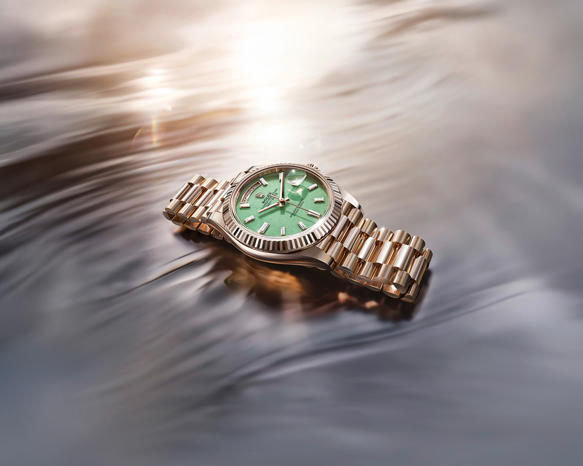Tỏa sáng dịu nhẹ. Không chỉ là màu sắc – mà còn là hiệu ứng. Oyster Perpetual Day-Date 40 ra mắt với chất liệu vàng Jubilee 18 ct. Với những sắc thái vàng dịu, xám ấm và hồng mềm mại, hợp kim hoàn toàn mới này, được phát triển và sản xuất nội bộ, minh họa khả năng đổi mới và sự tinh thông kỹ thuật của Rolex trong lĩnh vực kim loại quý.  Vẻ sang trọng của chiếc đồng hồ này càng được nâng cao nhờ việc lựa chọn đá aventurine màu xanh lục nhạt cho mặt số, sắc thái này hài hòa với hiệu ứng mạ vàng của vỏ và dây đeo.