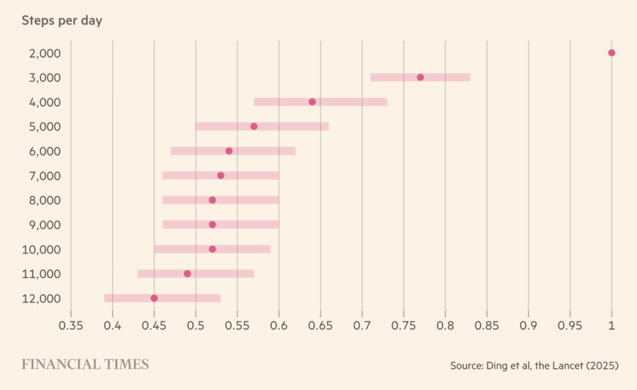 Kết quả cho thấy người đi 7.000 bước/ngày có tỷ lệ tử vong thấp hơn gần một nửa so với người đi 2.000 bước, đồng thời giảm nguy cơ tử vong do tim mạch, ung thư, tiểu đường type 2 và sa sút trí tuệ.