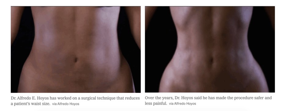 Năm 2023, bác sĩ Jósmer Zambrano, 45 tuổi, tại Caracas (Venezuela), quyết định tự thử nghiệm kỹ thuật mới. “Tôi luôn muốn có vòng eo nhỏ hơn,” bà kể. Sau phẫu thuật, ba tháng bó corset, eo của Zambrano giảm từ 30 inch xuống 23 inch (tương đương 76 cm xuống 58 cm).