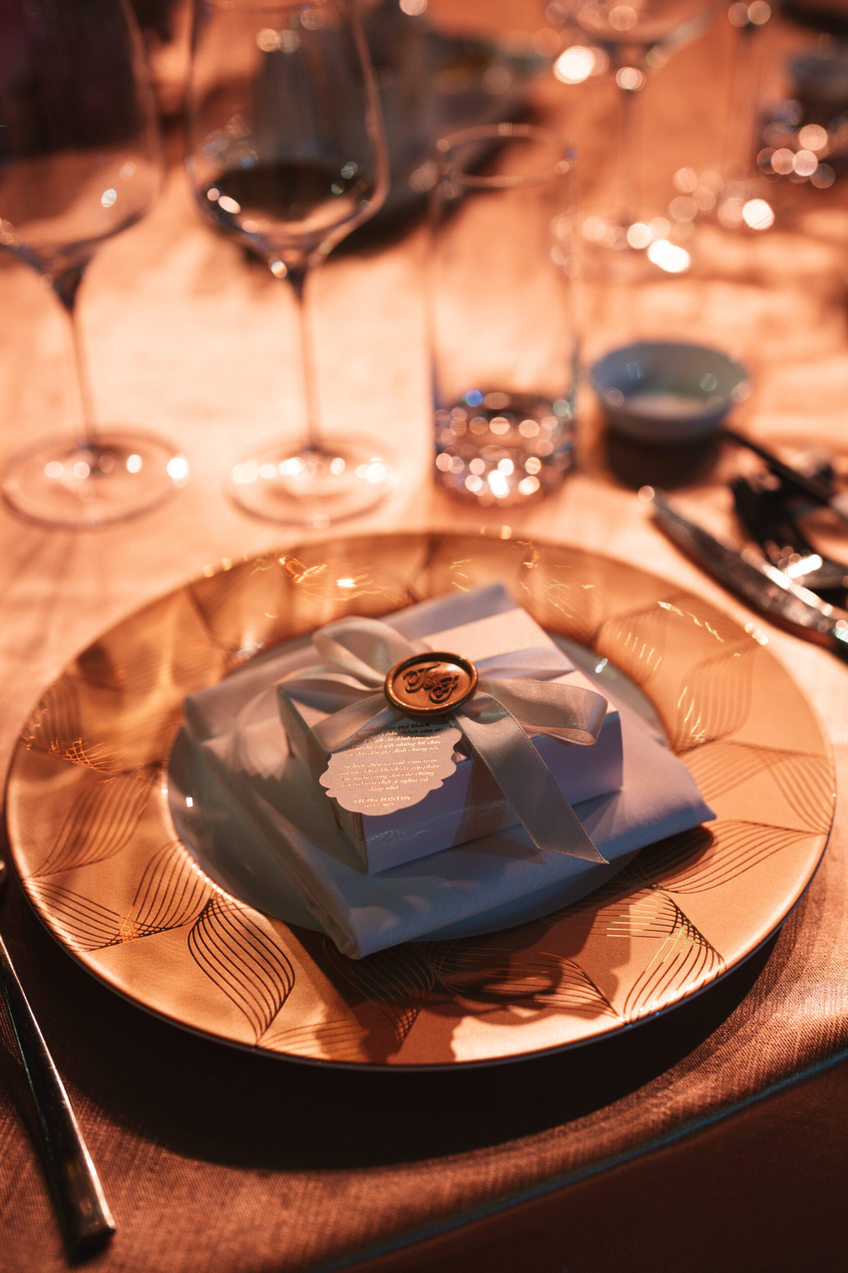 Theo ghi nhận, hộp quà cưới đặt trang trọng tại mỗi chỗ ngồi đến từ Socolatier – thương hiệu socola thủ công cao cấp vốn được giới mộ điệu yêu thích trong các sự kiện private. Thiết kế hộp tối giản, màu sắc nhã nhặn, phối ton-sur-ton với không gian tiệc, tạo nên tổng thể sang trọng ngay từ khoảnh khắc khách mời bước vào.