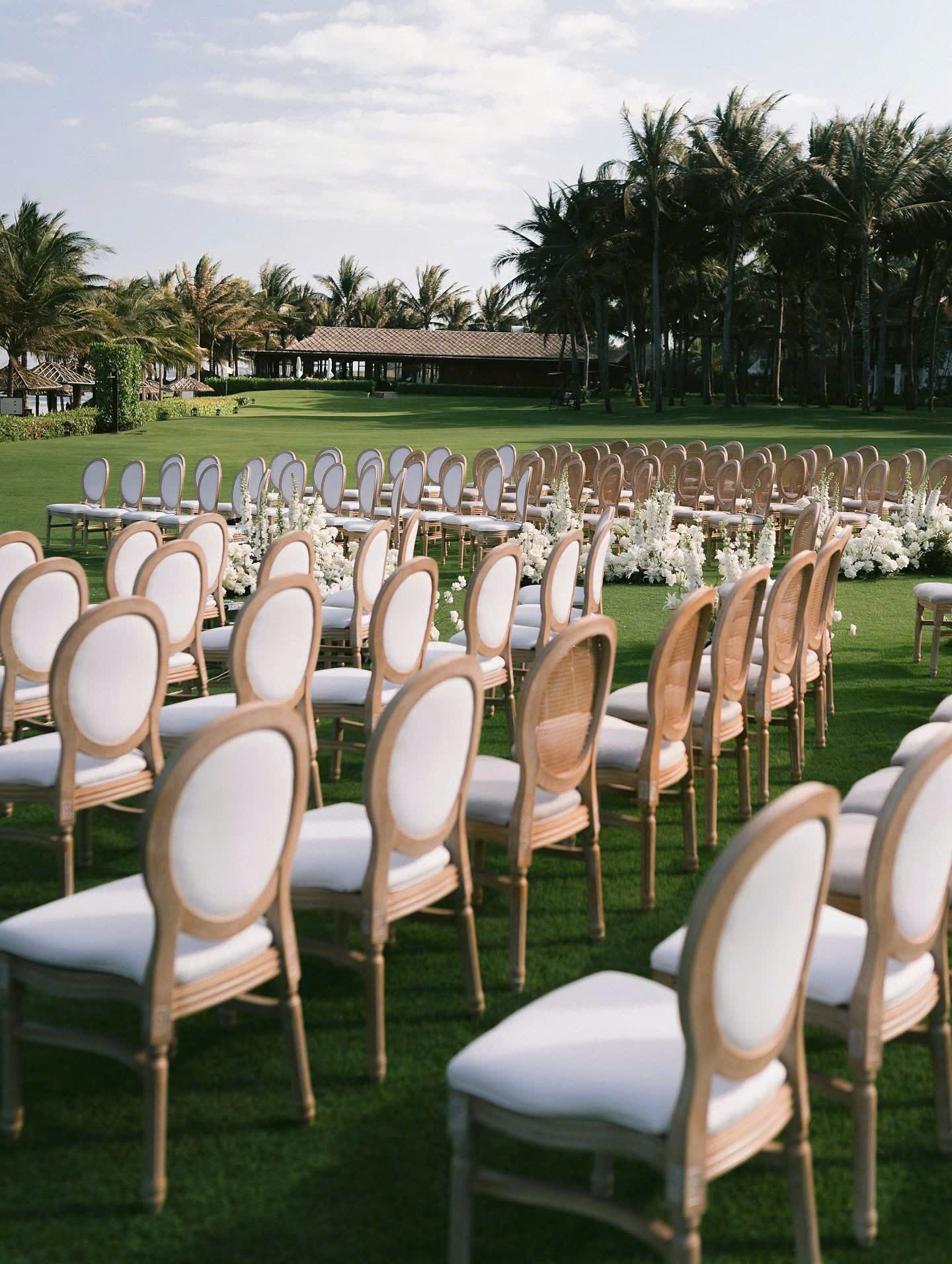 Tuy nhiên, chúng tôi cũng sẵn sàng tinh chỉnh linh hoạt về màu sắc, từ thay đổi tông màu nệm hay khung ghế cho đến các chi tiết phối màu nhằm mang đến một tổng thể bàn ghế vừa đẹp về hình thức, vừa ăn ý với không gian chung của sự kiện. Bởi với chúng tôi, bàn ghế không đơn thuần là vật dụng để ngồi, mà là yếu tố quan trọng góp phần nâng tầm vẻ đẹp tổng thể. Khi được lựa chọn đúng mẫu, đúng màu sắc và đúng tinh thần thiết kế, chúng sẽ hòa nhịp cùng không gian, tạo nên sự hài hòa, tinh tế và một dấu ấn thẩm mỹ khó quên.Wedding Symphony - vietnam luxury wedding list - one chair - nội thất cưới - bàn ghế - minh văn - luxuo quote