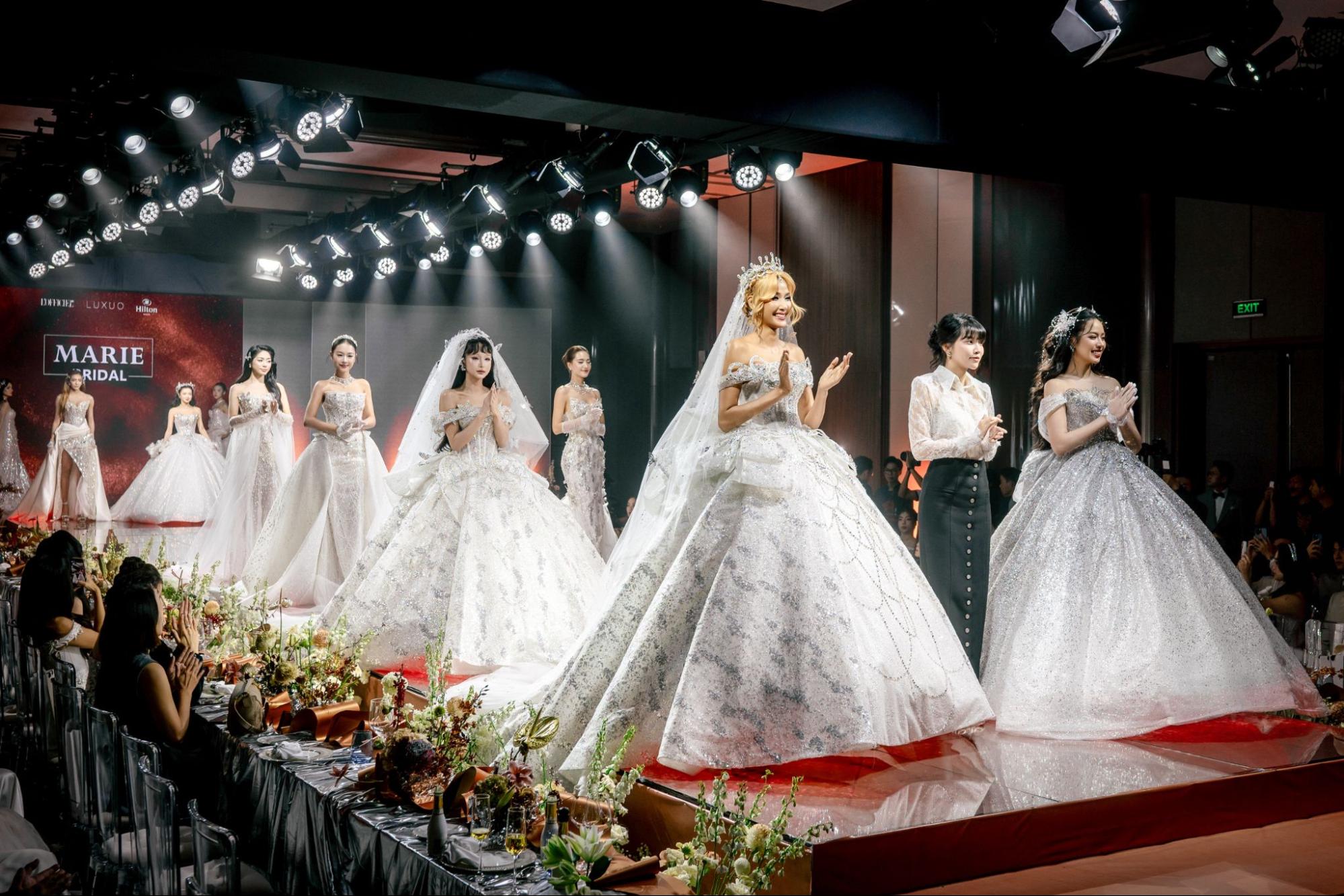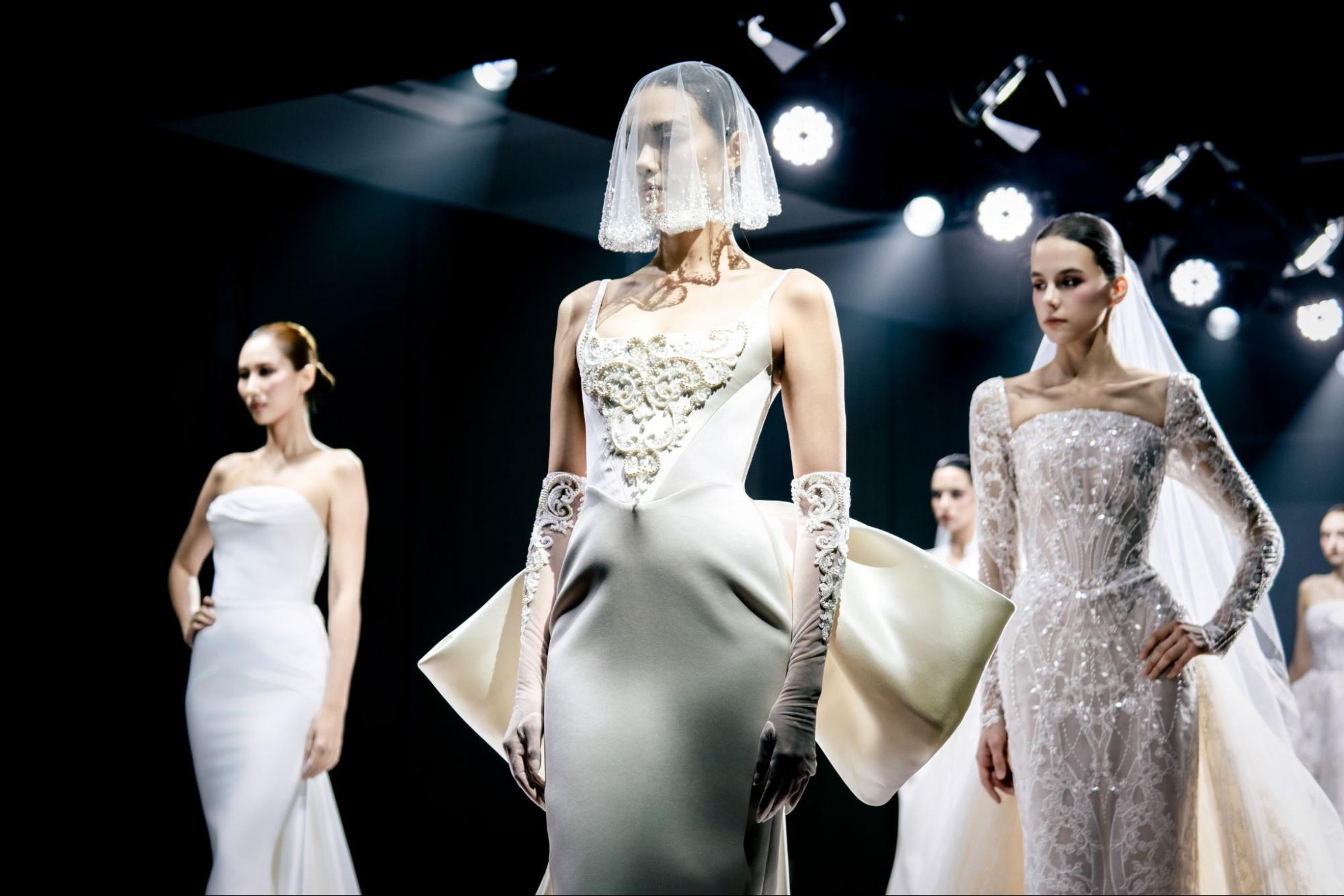 Ngày đầu tiên khép lại bằng sàn diễn thời trang cưới cao cấp, nơi các thương hiệu danh tiếng lần lượt trình làng bộ sưu tập mới nhất. Mở màn là Chung Thanh Phong Bridal với BST Timeless, được tôn vinh trọn vẹn khi Hoa hậu Kỳ Duyên đảm nhận vị trí Vedette. Tiếp nối, Cao Minh Saigon mang đến sự tinh tế cổ điển trong BST Timeless Elegance. Marie Bridal lại thổi vào không gian hơi thở lãng mạn qua BST Lumière, với Hoa hậu Thanh Thuỷ xuất hiện ấn tượng ở vị trí First Face và Á hậu Hoàng Thuỳ đảm nhận Vedette, trước khi cả hai cùng sải bước đôi đầy cảm xúc kết màn. Song song đó, CANALI khẳng định chuẩn mực quý ông hiện đại bằng những thiết kế lịch lãm, và vẻ đẹp phá cách được Hacchic Couture trình diễn trong BST Lunar Fracture. Điểm nhấn cao trào chính là màn diễn đôi của Hacchic Couture và CAO Fine Jewellery, khi Vedette Hương Liên xuất hiện trong thiết kế váy phát sáng, tỏa sáng cùng những tuyệt tác trang sức trong BST Mobius – Love with Certainty của CAO.