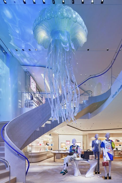Tuy nhiên, sự thay đổi của cửa hàng Louis Vuitton không chỉ có thể. Đằng sau mặt nước phẳng lặng với những gợn lăn tăn chính là không gian bán lẻ trải dài bốn tầng lầu, được Peter Marino sửa đổi toàn bộ. Không chỉ có phần mặt tiền được làm mới hoàn toàn, phần cầu thang được làm hoàn toàn từ gỗ sồi mang lại cảm giác dòng nước len lỏi chảy khắp các quầy và ‘nhảy múa’ tại trần nhà. Trong khi đó, màu sắc nhẹ nhàng mang đến tinh thần phấn chấn, tươi mới và thoải mái với bức tường chạy dọc khắp bốn tầng lầu khắc họa bức tranh của Kimiko Fujimura.