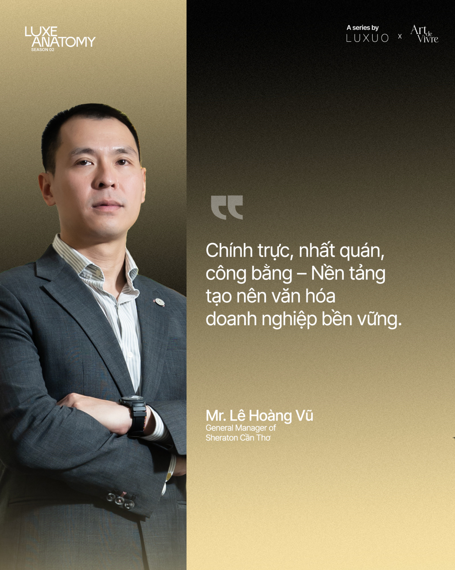 Tinh thần ấy tiếp tục được thể hiện rõ nét qua câu chuyện của anh Lê Hoàng Vũ – General Manager khách sạn Sheraton Cần Thơ. Với hơn 14 năm kinh nghiệm quốc tế và dấu ấn lãnh đạo tại nhiều khách sạn danh tiếng trên toàn cầu, anh Vũ hiểu sâu sắc vai trò của một môi trường làm việc nơi tư duy phản biện và tinh thần minh bạch được khuyến khích, và các quyết định quan trọng được đưa ra dựa trên sự đồng thuận tập thể. Anh nhấn mạnh tầm quan trọng của việc xây dựng văn hóa doanh nghiệp dựa trên nền tảng đạo đức lãnh đạo với ba giá trị cốt lõi là: sự chính trực, tính nhất quán và tinh thần công bằng.