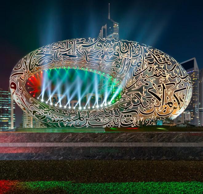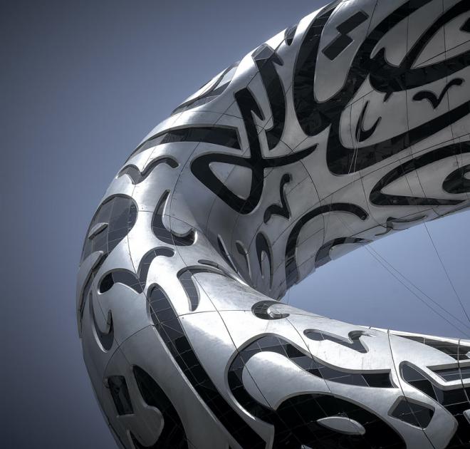 Phía bên ngoài bảo tàng được trang trí bởi các bức thư pháp Ả Rập. Trong đó là câu nói của nhà lãnh đạo Dubai: “Đổi mới không phải là một thứ xa xỉ về trí tuệ. Đó là bí mật đằng sau sự trẻ hoá và tiến hoá của các quốc gia và dân tộc”.