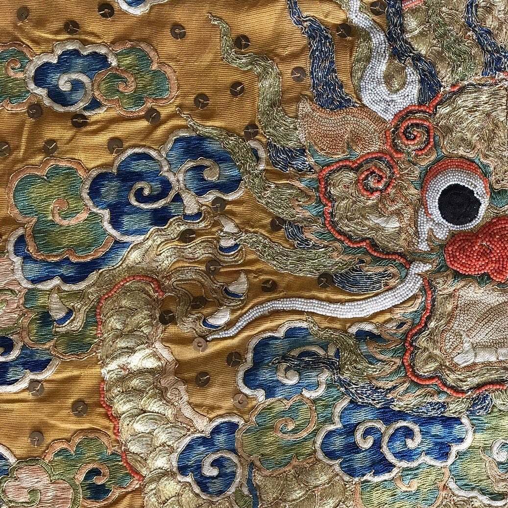 Chi tiết thêu nhồi/độn gòn và bắt trân châu, san hô ở khuôn mặt rồng trên long bào nhà Nguyễn (nguyên thuộc BST Phạm Lan Hương).