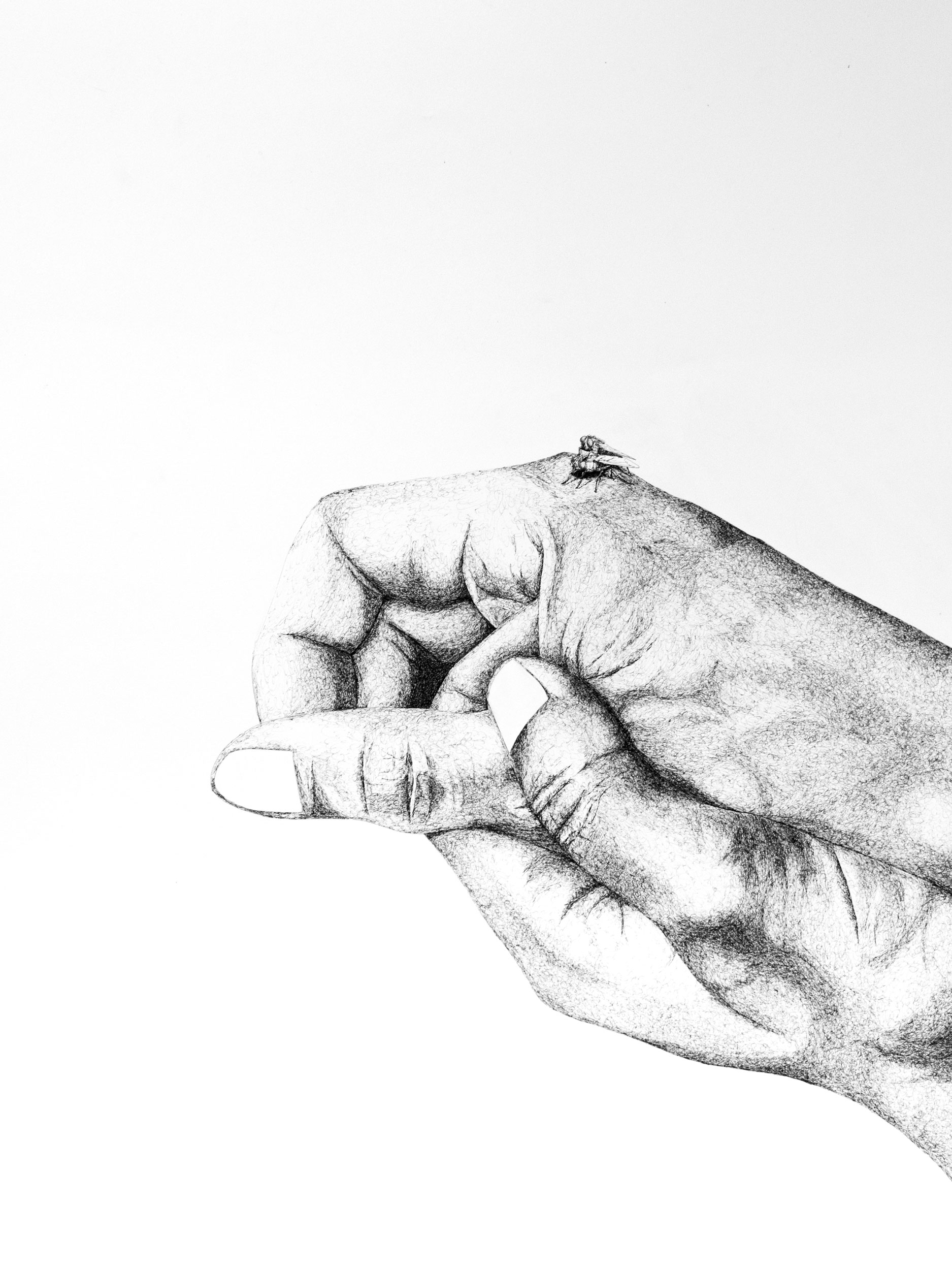Quá trình vẽ của tôi là việc liên tục lặp lại giữa phóng to và thu nhỏ. Như thể khi tôi bật chế độ cận cảnh lên, tôi sẽ đi thật sâu vào nó. Có một khoảnh khắc khi bạn vẽ và bắt đầu có một sự đồng cảm mạnh mẽ nào đó đối với chủ đề bạn đang làm. Ví dụ, nếu tôi đang vẽ một số chi tiết của da, tôi sẽ bắt đầu thực sự cảm nhận được làn da, sau đó tôi cố gắng trở thành làn da này. Có thể đó chỉ là sự phóng chiếu nhưng đó cũng là một cảm xúc rất mạnh.