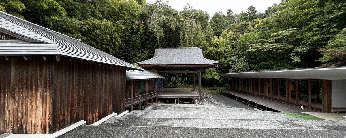 Sân khấu kịch Nō trong rừng ở Miyagi, với các khối sân khấu bên trái theo lối kiến trúc truyền thống và dãy nhà xem kịch bên phải với hình khối đơn giản và hiện đại. Ảnh: Muri Butai