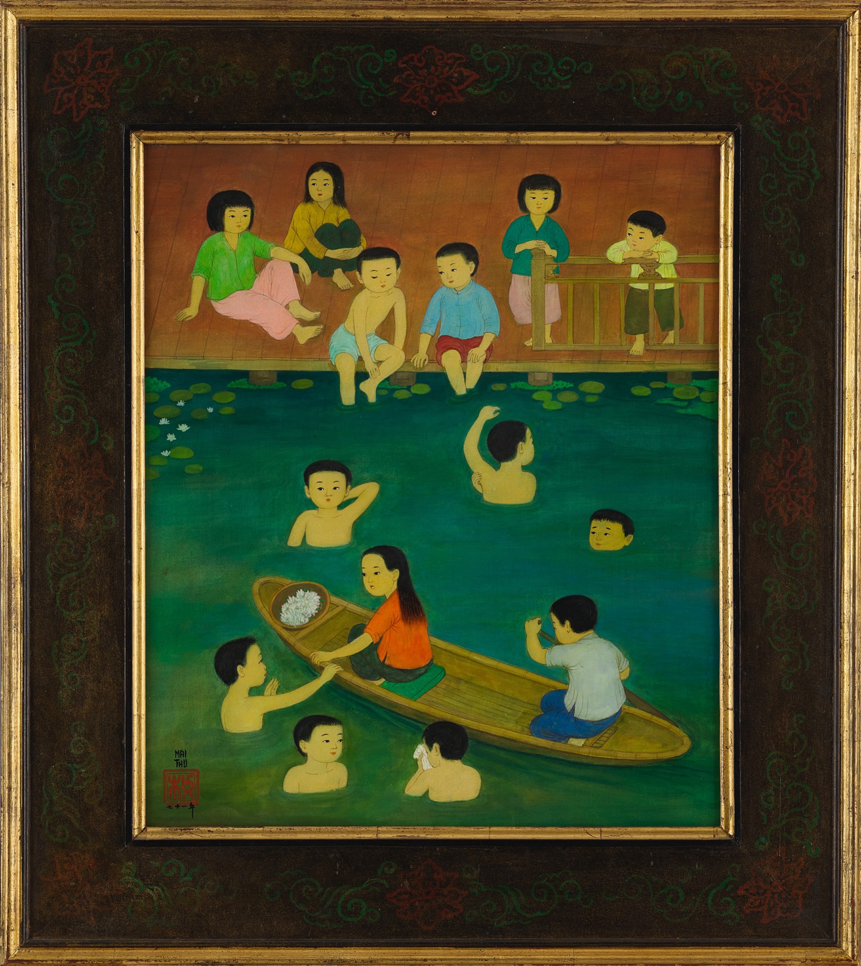 Tre tam ← Previous Next → Trẻ tắm (Mai Thứ), 1971, mực và gouache trên lụa, 54,5cm x 46 cm / Les Enfants Au Bain, 1971, Ink and gouache on silk, 54,5cm x 46 cm.