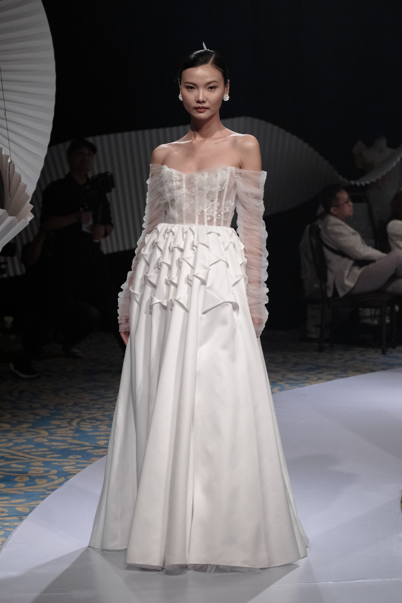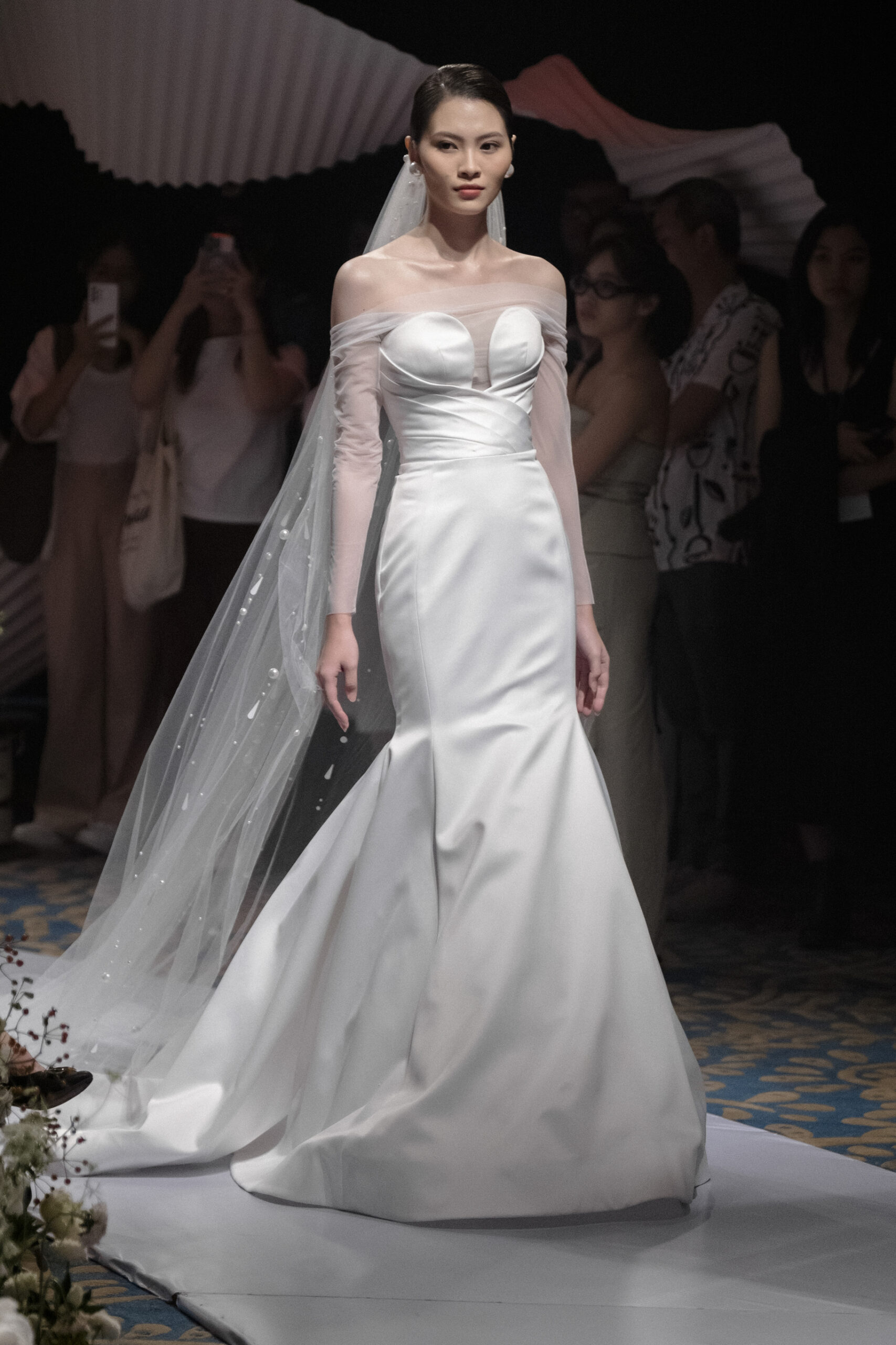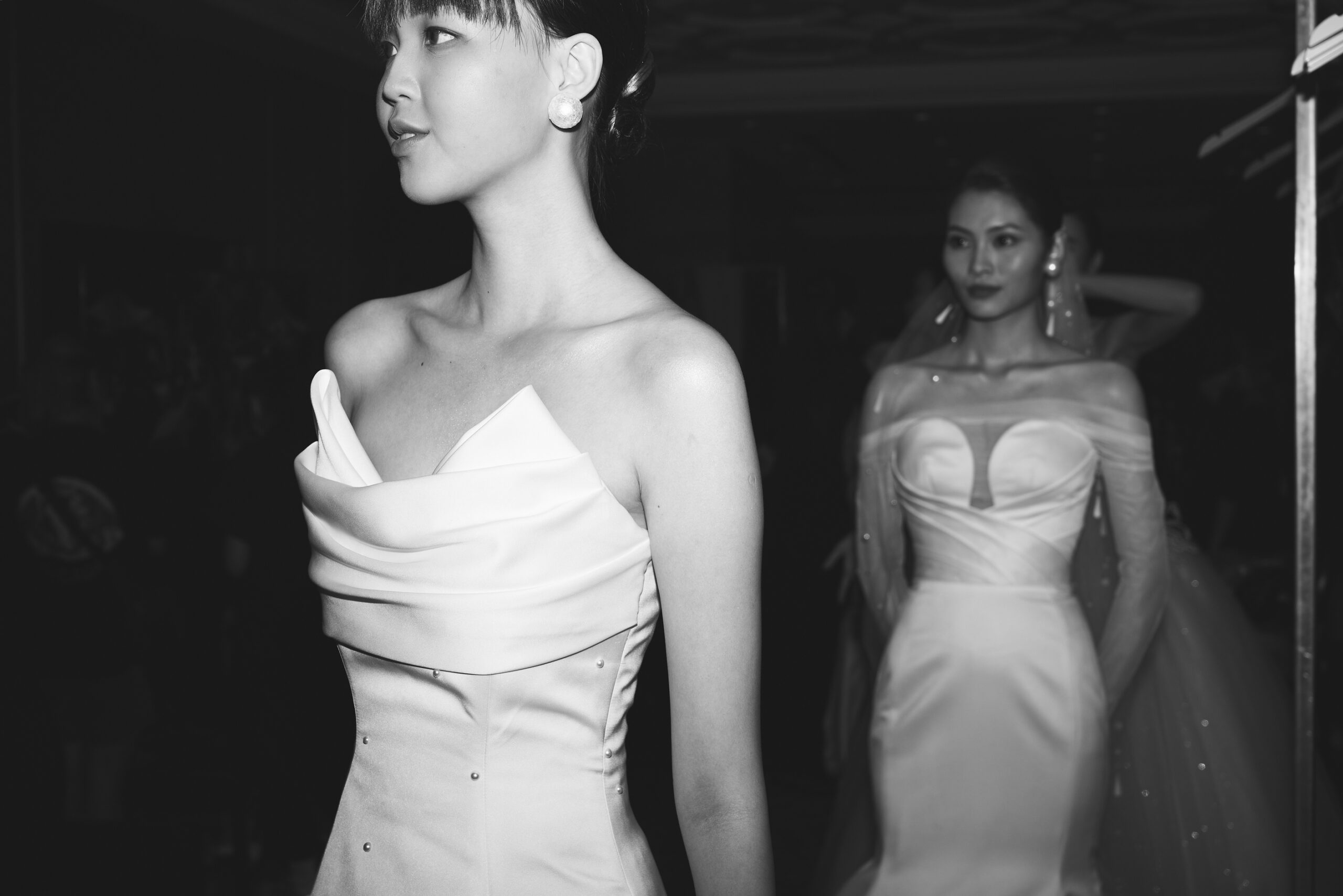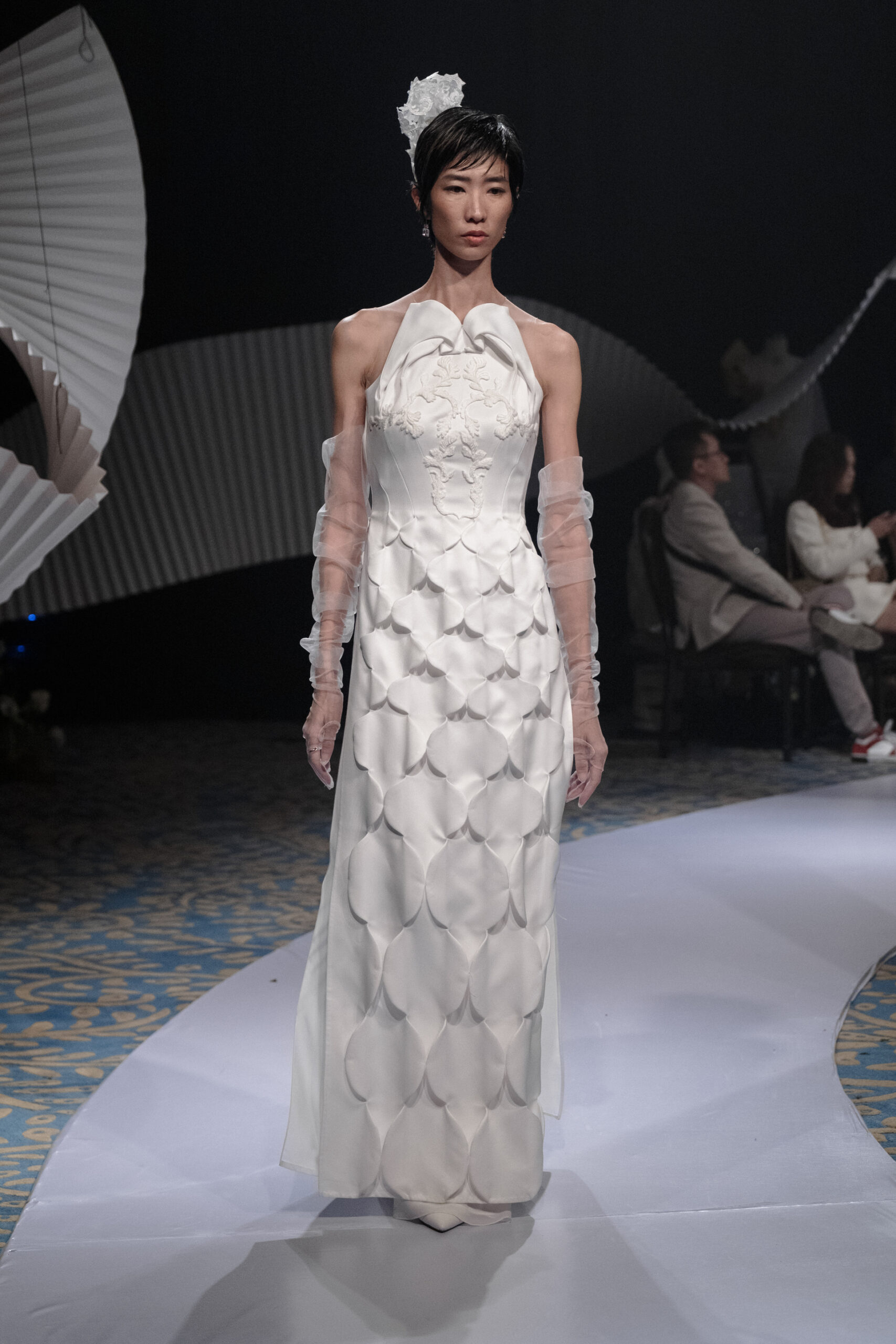 15 thiết kế không đi theo những chuẩn mực của các mẫu váy cưới thông thường. Giới mộ điệu không thấy những phom dáng công chúa, cầu kỳ quen thuộc mà thay vào đó, là những kiểu dáng mang tính đột phá như đầm cổ yếm, đầm ngắn bất đối xứng, crop top đi kèm chân váy xòe bồng hay đầm hai dây mỏng manh… Ngôn ngữ thanh lịch được thể hiện qua việc nhà thiết kế khéo léo sử dụng các viên ngọc trai không tròn để đính kết thành nhiều họa tiết, hình họa tạo điểm nhấn cho trang phục. Ngọc trai cũng được sử dụng để tăng nét sang trọng thông qua việc biến hóa thành thắt lưng, dây ngọc trai hay phần trang trí ở bờ vai…, tôn vinh khéo léo đường cong của các cô dâu một cách tự nhiên, không gắng gượng.