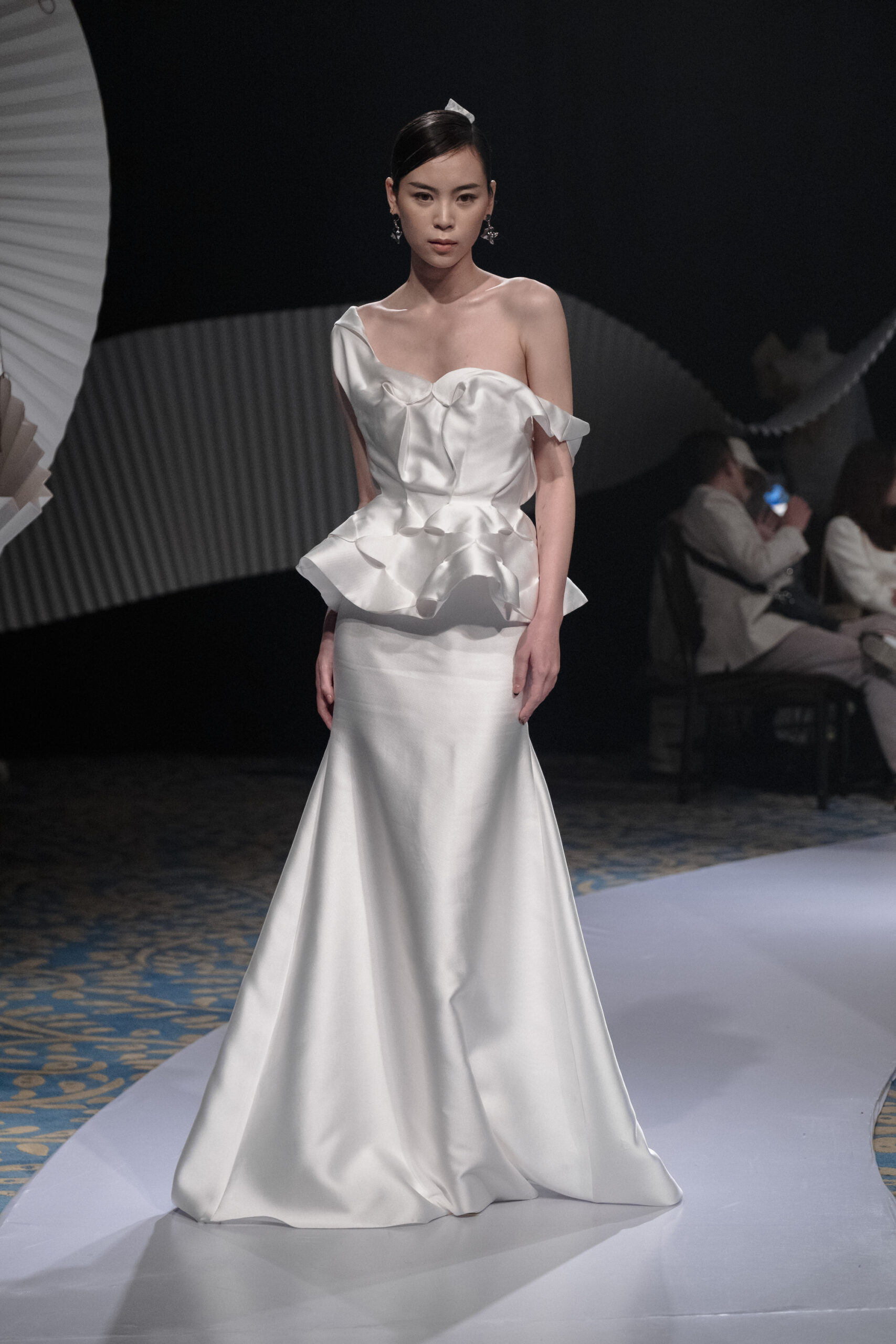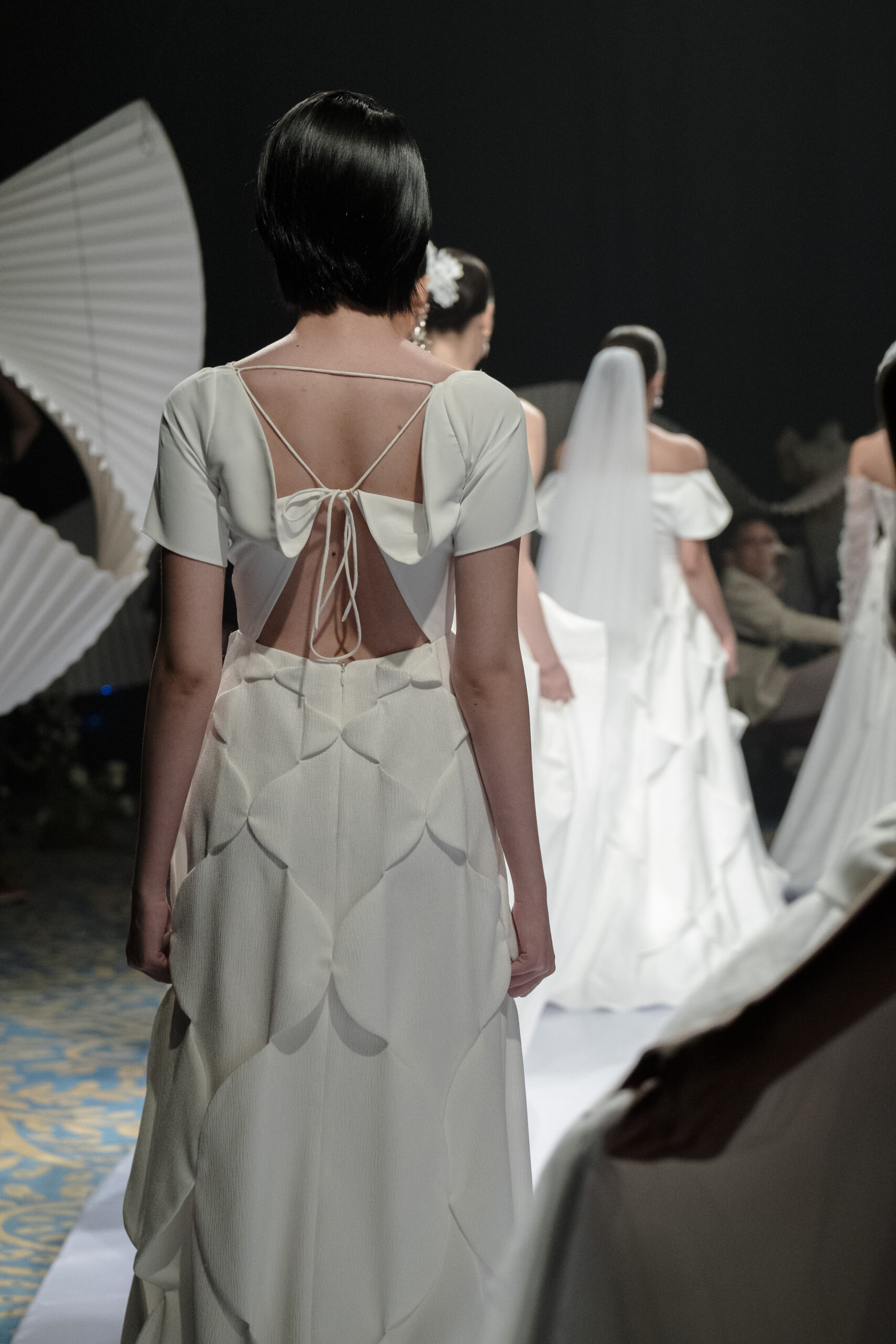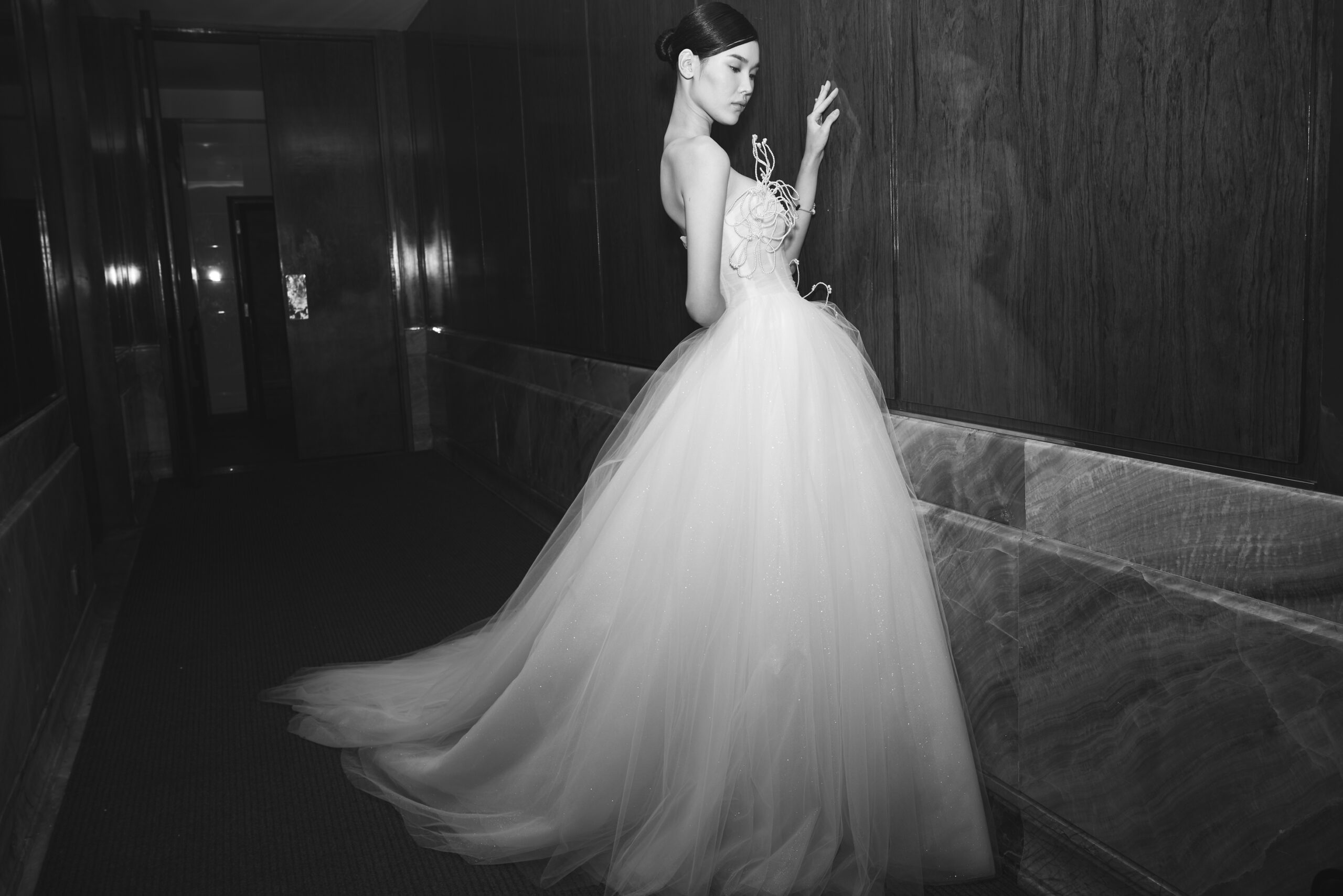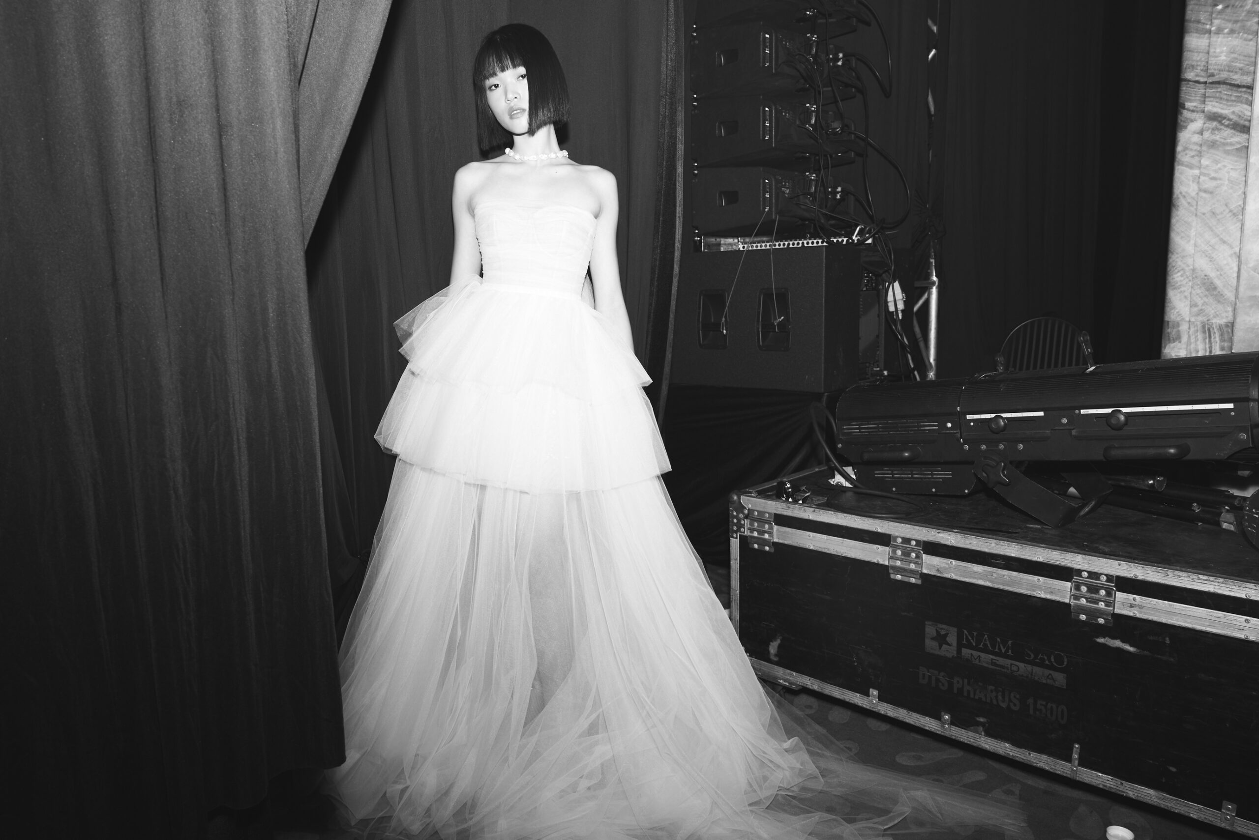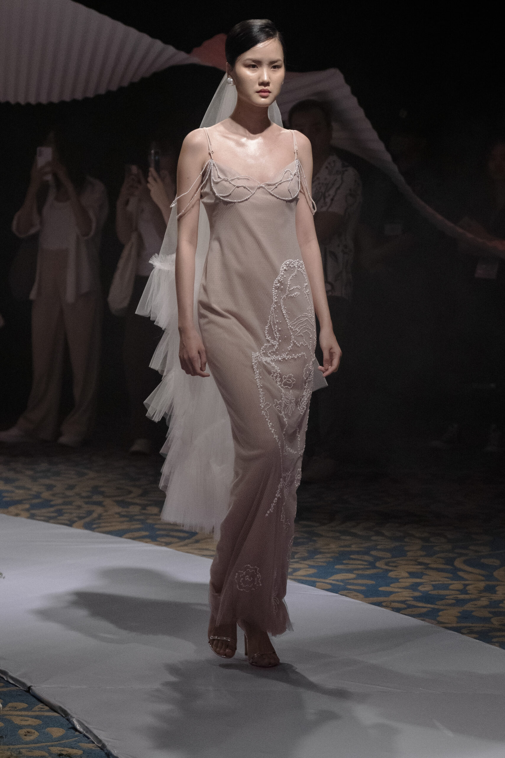 15 thiết kế không đi theo những chuẩn mực của các mẫu váy cưới thông thường. Giới mộ điệu không thấy những phom dáng công chúa, cầu kỳ quen thuộc mà thay vào đó, là những kiểu dáng mang tính đột phá như đầm cổ yếm, đầm ngắn bất đối xứng, crop top đi kèm chân váy xòe bồng hay đầm hai dây mỏng manh… Ngôn ngữ thanh lịch được thể hiện qua việc nhà thiết kế khéo léo sử dụng các viên ngọc trai không tròn để đính kết thành nhiều họa tiết, hình họa tạo điểm nhấn cho trang phục. Ngọc trai cũng được sử dụng để tăng nét sang trọng thông qua việc biến hóa thành thắt lưng, dây ngọc trai hay phần trang trí ở bờ vai…, tôn vinh khéo léo đường cong của các cô dâu một cách tự nhiên, không gắng gượng.