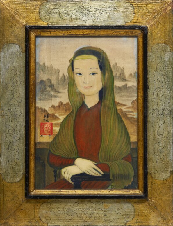 - Mai Trung Thứ, “Mona Lisa” (1958), bột màu trên lụa, 34,5 x 27,6 cm. Tác phẩm bao gồm khung do họa sỹ tự làm.