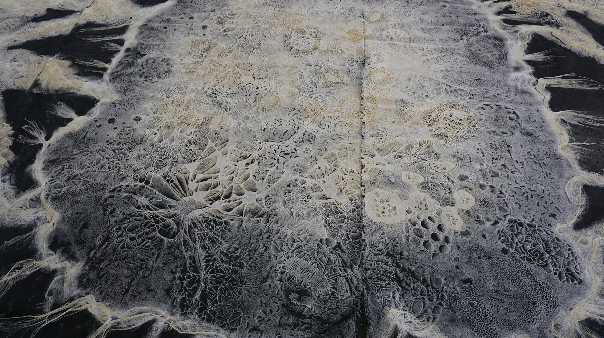 - Chi tiết ‘Bản Ngã Xếp Lớp 1’ – Dự án Cục Im Lặng – Nhà thiết kế Nguyễn Công Trí cộng tác cùng Nghệ Thuật Trúc Chỉ Việt Nam – Trúc Chỉ trên lụa (18 tấm) 3 tấm: 580 x 100 cm 15 tấm: 580 x 150 cm