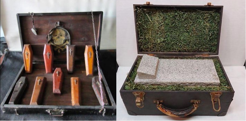 Trái: Các mẫu quan tài mini của hãng Funeral Director trong thế kỷ XIX. Phải: Mẫu ngôi mộ mini trong va li của một travelling salesman, khoảng 1940s-50s, với ưu điểm cạnh tranh (selling points) là nắp mộ và bia mộ được làm bằng đá granite gray blue. Nguồn: Messynessychic.com