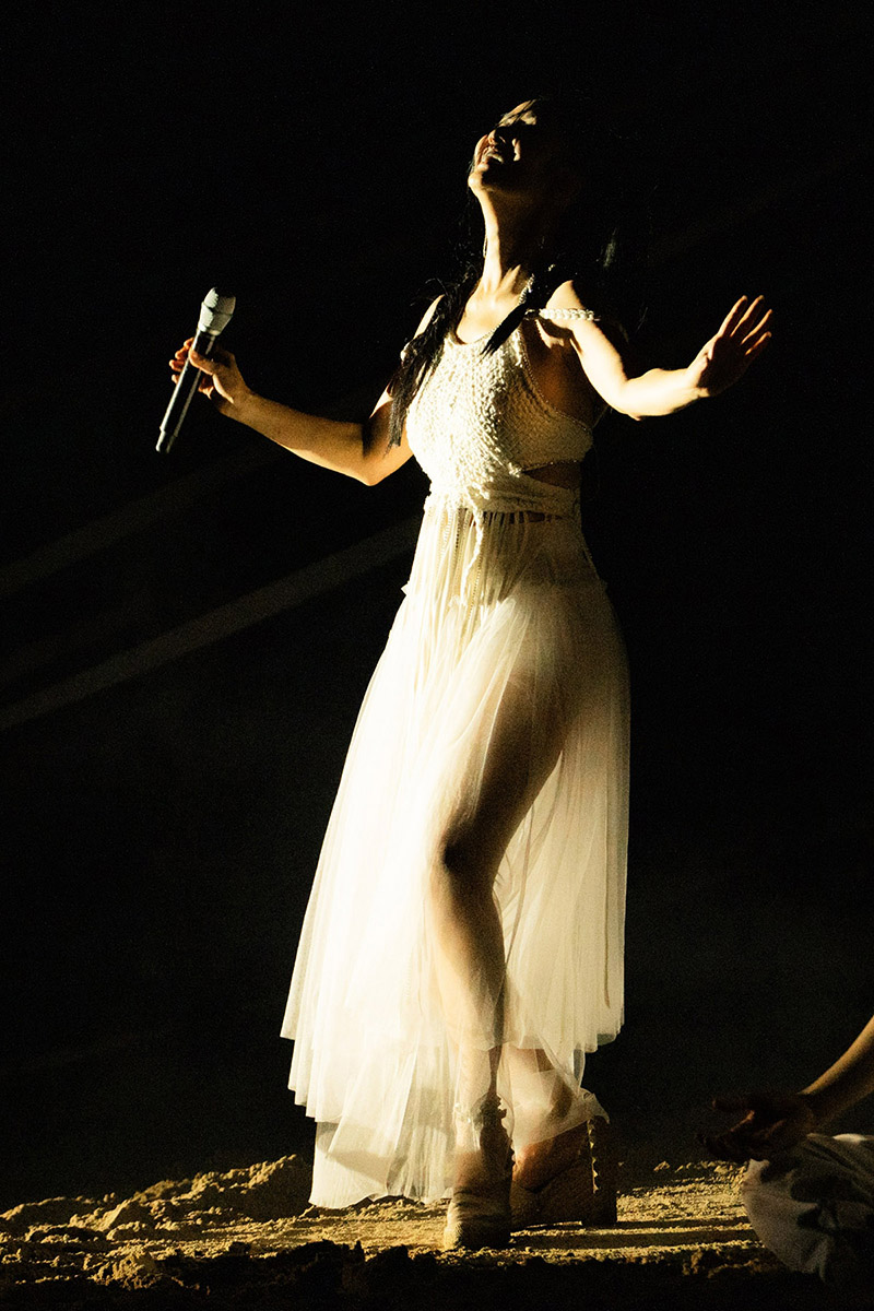 Tiếp theo là nghệ thuật trình diễn thực cảnh, mang hơi thở đương đại trong nguồn mạch dân gian, bởi Tổng Đạo diễn Cao trung Hiếu. Sân khấu được dàn dựng trải rộng giữa thiên nhiên kỳ vĩ – nơi sóng biển làm nhạc nền, núi Voi và rừng cây thành phông cảnh và cát trắng trở thành tấm thảm dẫn lối cho cảm xúc. Sân khấu là những quả trứng lớn đặt giữa không gian thiên nhiên, là biểu tượng của sự khởi sinh, trong sự hòa hợp với thiên nhiên, mang thông điệp bảo tồn môi trường biển, gợi nhắc về mối liên kết giữa con người và sự sống nguyên bản.
