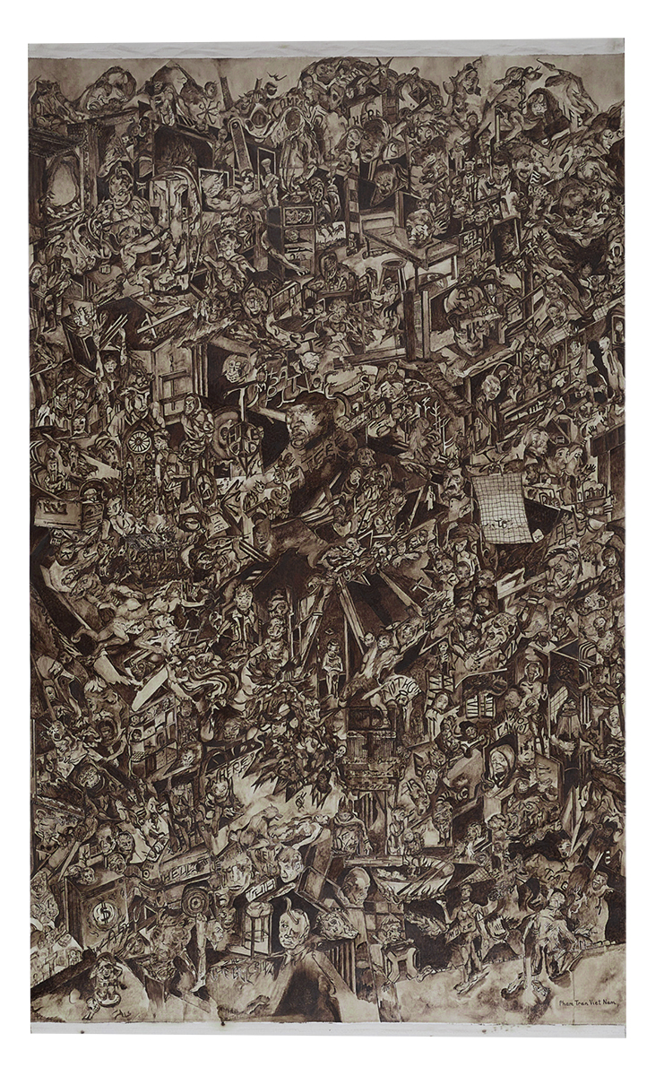 Vào ngày 10/05/2025, với sự tham gia giám tuyển của nhà nghiên cứu mỹ thuật Ngô Kim Khôi, 22 tác phẩm của hoạ sĩ Phạm Trần Việt Nam được giới thiệu trong triển lãm lần này mời gọi chúng ta bước vào một không gian siêu hình nơi sinh-tử hòa quyện vào nhau trong một chu kỳ tiếp nối vĩnh cửu. “Vòng Sinh Tử” là một vọng gác siêu hình, ở đó họa sĩ trở thành chứng nhân của những hình hài và mảnh vỡ hiện lên ám ảnh từ những “Hư không”, “Trầm tích”, “Trong vòng sinh tử”, “Vọng chúng sinh”, “Nhân danh ai”, “Babel”, “Hang ổ”… Tranh của Phạm Trần Việt Nam luôn hằn sâu những trăn trở hiện sinh: những linh hồn lưu lạc, những ký ức chưa được gọi tên và những vết thương chưa khép miệng hiện lên qua những lát cắt dán chồng chất và khuôn mặt ám ảnh, như một lời gọi hồn.