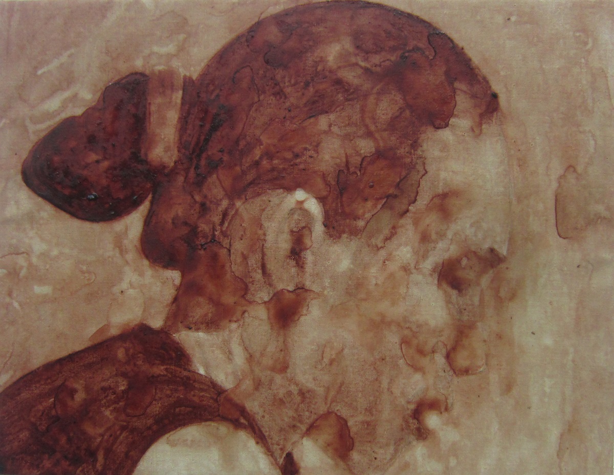 Chân dung thợ mổ_2021_31x42cm_Máu bò, muối, phèn chua, bút chì, keo acrtulic trên linen. ← Previous Next →