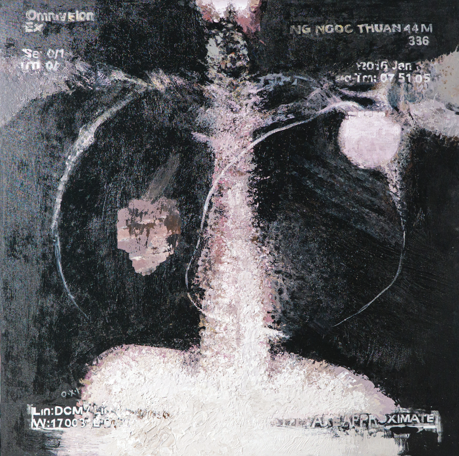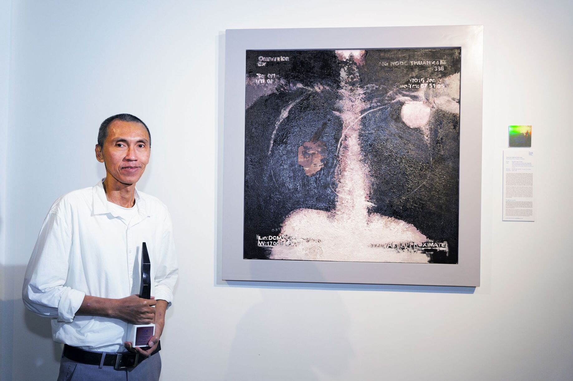 Ở hạng mục Nghệ sĩ Triển vọng, nghệ sĩ Nguyễn Ngọc Thuần – 53 tuổi đến từ Bình Thuận – đã giành giải Nghệ sĩ Triển vọng nhất năm 2025 (Việt Nam) với tác phẩm đầu tay mang tên “Chân dung tự họa, 2025 (cuộc sống bắt rễ trong tôi dưới hình bóng một cái cây)”. Được thể hiện bằng chất liệu acrylic trên vải bố, tác phẩm lấy cảm hứng từ hình ảnh chụp X-quang lồng ngực và thiết bị ICD (thiết bị phá rung tim) đã được cấy ghép vào cơ thể ông suốt một thập kỷ qua. Thiết bị kết nối trực tiếp với tim, trở thành một “cây mẹ” mang tính biểu tượng bén rễ trong ông – khơi gợi những câu hỏi về bản sắc và định nghĩa của con người trong thời đại mà công nghệ y học ngày càng kéo dài sự sống.