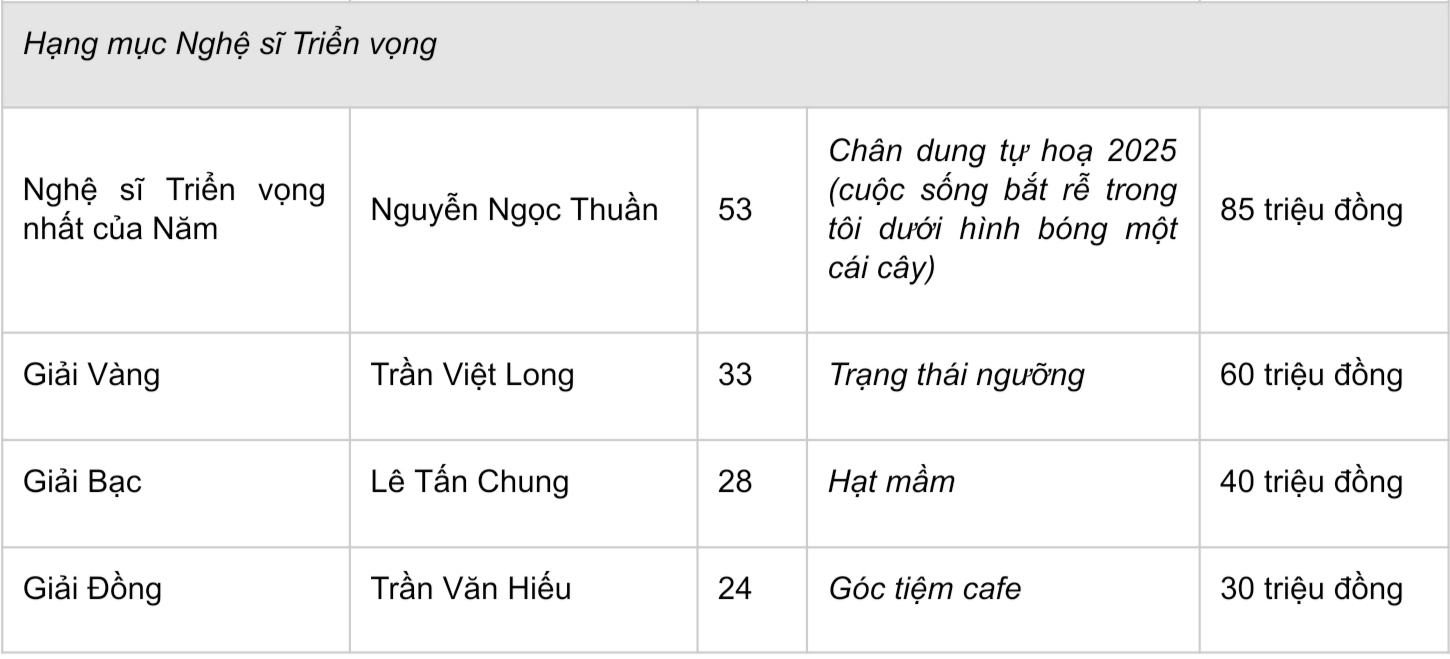 “Chân dung tự họa, 2025 (cuộc sống bắt rễ trong tôi dưới hình bóng một cái cây)” của nghệ sĩ Nguyễn Ngọc Thuần giành giải Nghệ sĩ Triển vọng nhất năm 2025 (Việt Nam), hạng mục Nghệ sĩ Triển vọng.
