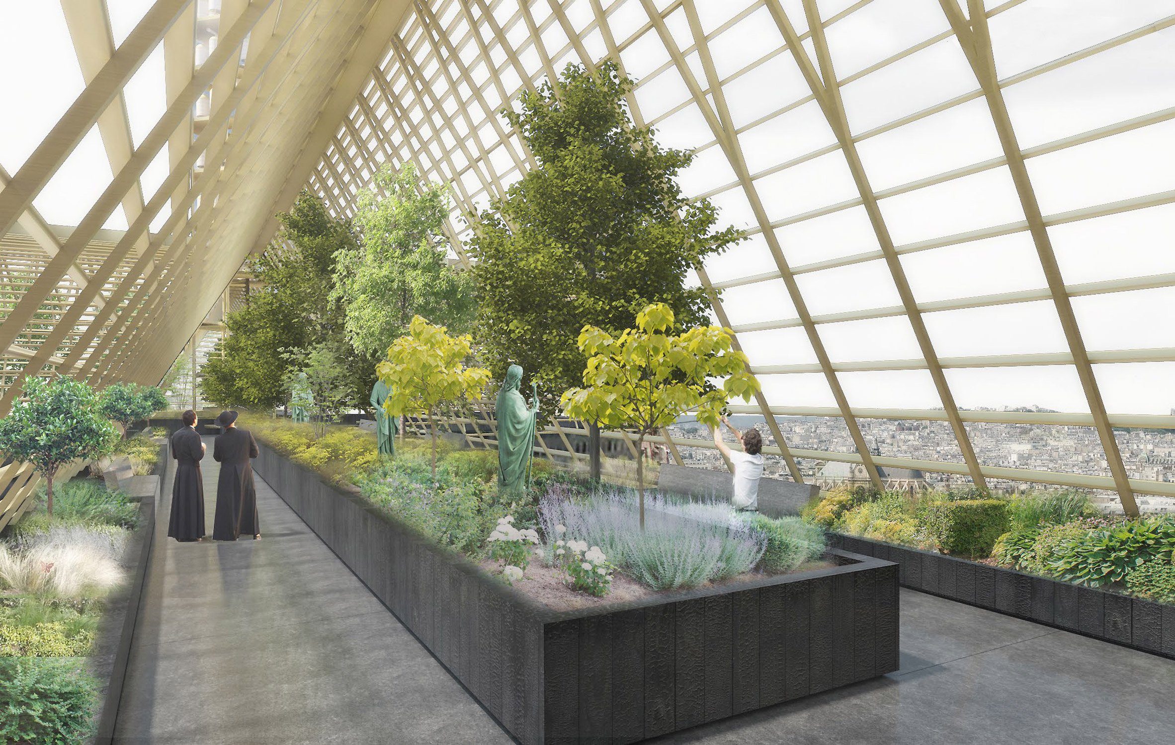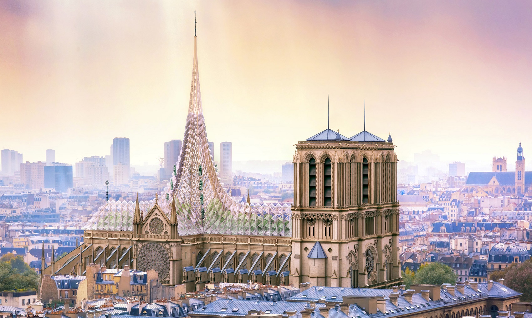 Một đề xuất tiêu biểu khác đến từ kiến trúc sư Vincent Callebaut với sự kết hợp khoa học, nghệ thuật và tâm linh. Vincent hy vọng sẽ thiết lập mối quan hệ cộng sinh công bằng giữa con người và thiên nhiên. Theo đó, các cột trụ bị phá hủy sau đám cháy được thay thế bằng khung gỗ sồi nghiêng 55 độ, kéo dài thẳng đứng thành hình đỉnh tháp mới. Bộ khung gỗ được gia cố bằng thanh sợi carbon, phần mái gồm khung gỗ sồi và các mảnh thủy tinh 3 chiều có khả năng sản xuất điện, nhiệt và lưu thông không khí. Chưa dừng lại ở đó, Callebaut còn cho trồng một khu vườn hoành tráng dưới vòm kính rộng lớn và ước tính có thể thu hoạch 21 tấn trái cây và rau mỗi năm.