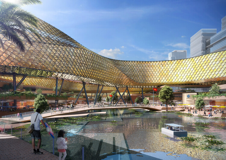 Toà tháp được kết hợp bởi hai phần: tầng trệt là địa hình nhân tạo được lấy cảm hứng từ đầu rồng. Các bậc thang kết nối gợi liên tưởng tới núi Cô Tiên dẫn đến quảng trường trung tâm. Đối với các hồ nước, kiến trúc sư đã lấy cảm hứng từ vùng đất Sa Pa với ruộng bậc thang làm không gian công cộng, đóng vai trò như hồ chứa kiểm soát lũ lụt trong khu vực.
