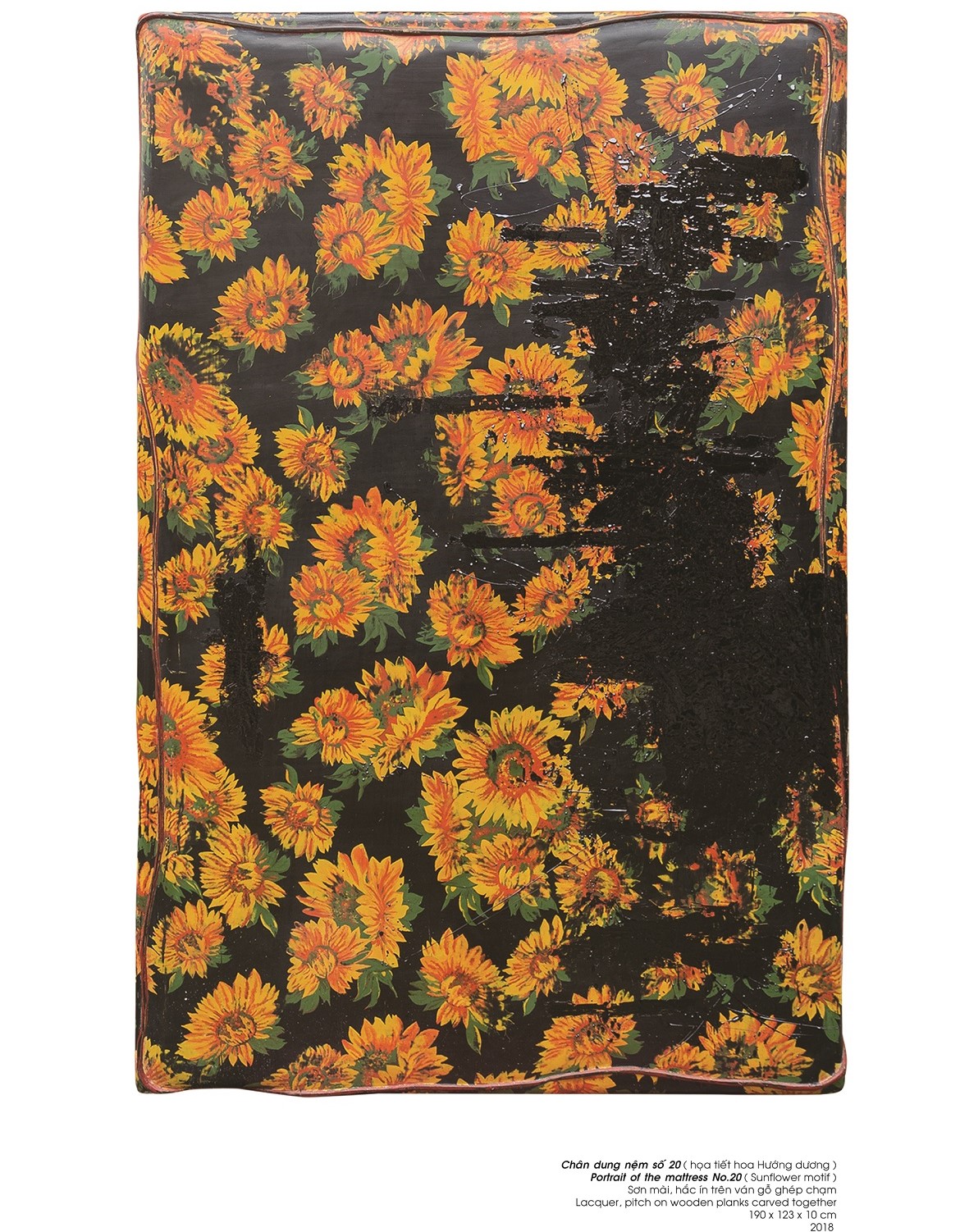 Bên cạnh những thông điệp sâu sắc ấy, “Chân dung nệm” là cuộc trưng bày với thực đơn chất liệu đa dạng, mang đến trải nghiệm thụ hưởng thú vị cho người xem. Những chất liệu này đối chọi và đối thoại với nhau nhấn mạnh ý đồ sáng tác đa phương tiện về lâu dài của tác giả.
