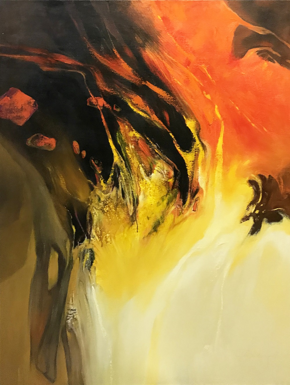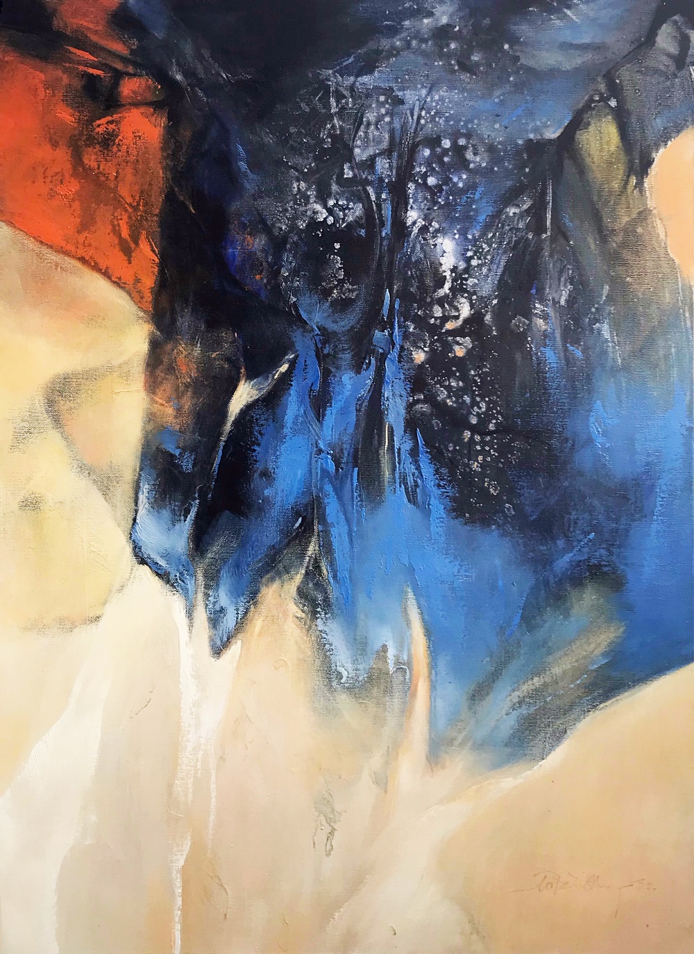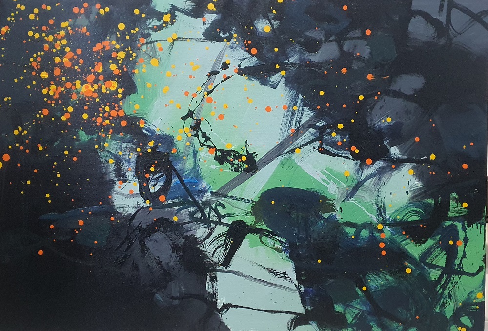 Cũng là một Sắc Xuân trừu tượng nhưng năng lượng trong tranh của Võ Văn Quý vừa mãnh liệt vừa pha chút trầm mặc. Hai cung bậc tưởng chừng trái dấu nhưng lại mang đến ấn tượng thị giác hài hòa mà riêng biệt. Màu nóng lẫn màu lạnh mà Quý dùng như “rực lên” đầy táo bạo để ẩn hiện trong đó một thế giới huyền bí mời gọi trí tò mò của người thưởng thức.