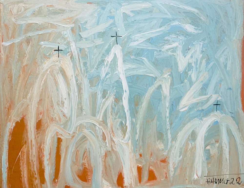 “Tiếng chuông nhà thờ” là một hình ảnh ẩn dụ cho những khoảng lặng thiêng liêng mà con người giữa chốn phù hoa này mong muốn tìm về và ẩn nấu. Khi một tiếng chuông ngân vang, lòng người như tĩnh lại rất sâu sau những xốn trộn và thăng trầm. Hình-sắc trong tranh Hùng bao trùm không gian một âm thanh ngân dài vang vọng nhưng sự vang vọng ấy lại như thức tỉnh bản giác của mỗi người về tính thiện và lòng vị tha.