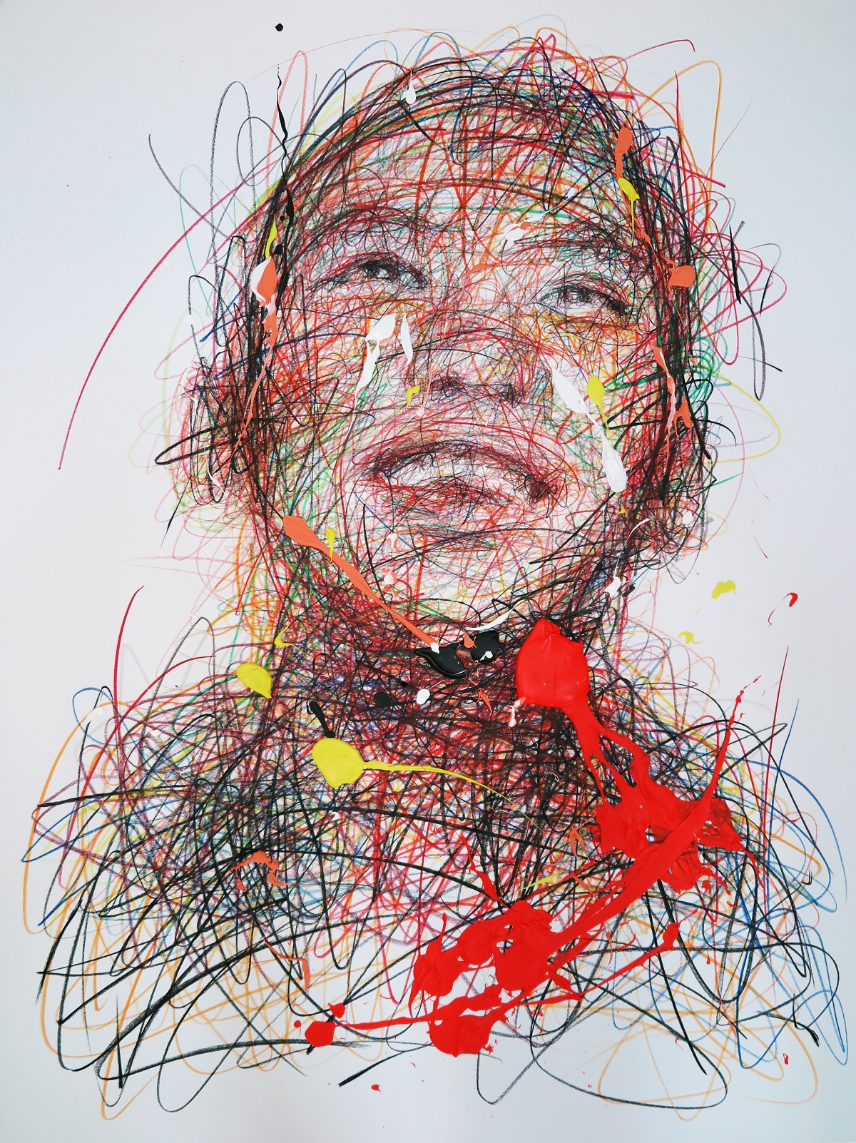 Tôi thích sáng tác với những kích thước lớn. Trước khi bắt đầu một tác phẩm, tôi luôn quan sát và kiểm tra nó để xem nó sẽ phản ứng ra sao với nét vẽ của mình. Làm việc trên các định dạng lớn cho phép tôi và khung vẽ trở thành một, nó thúc đẩy sự tự do cũng như tạo ra liên kết vô cùng mạnh mẽ.