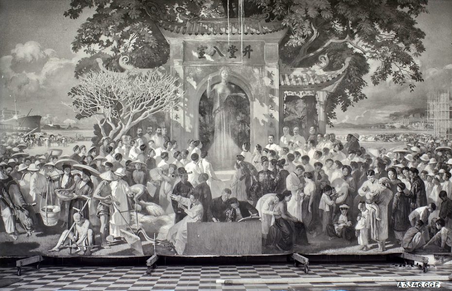 Giáo sư Victor Tardieu trước bức tranh đang vẽ cho Trường Đại Học Đông Dương, năm 1923. Nguồn: flickr/manhhai