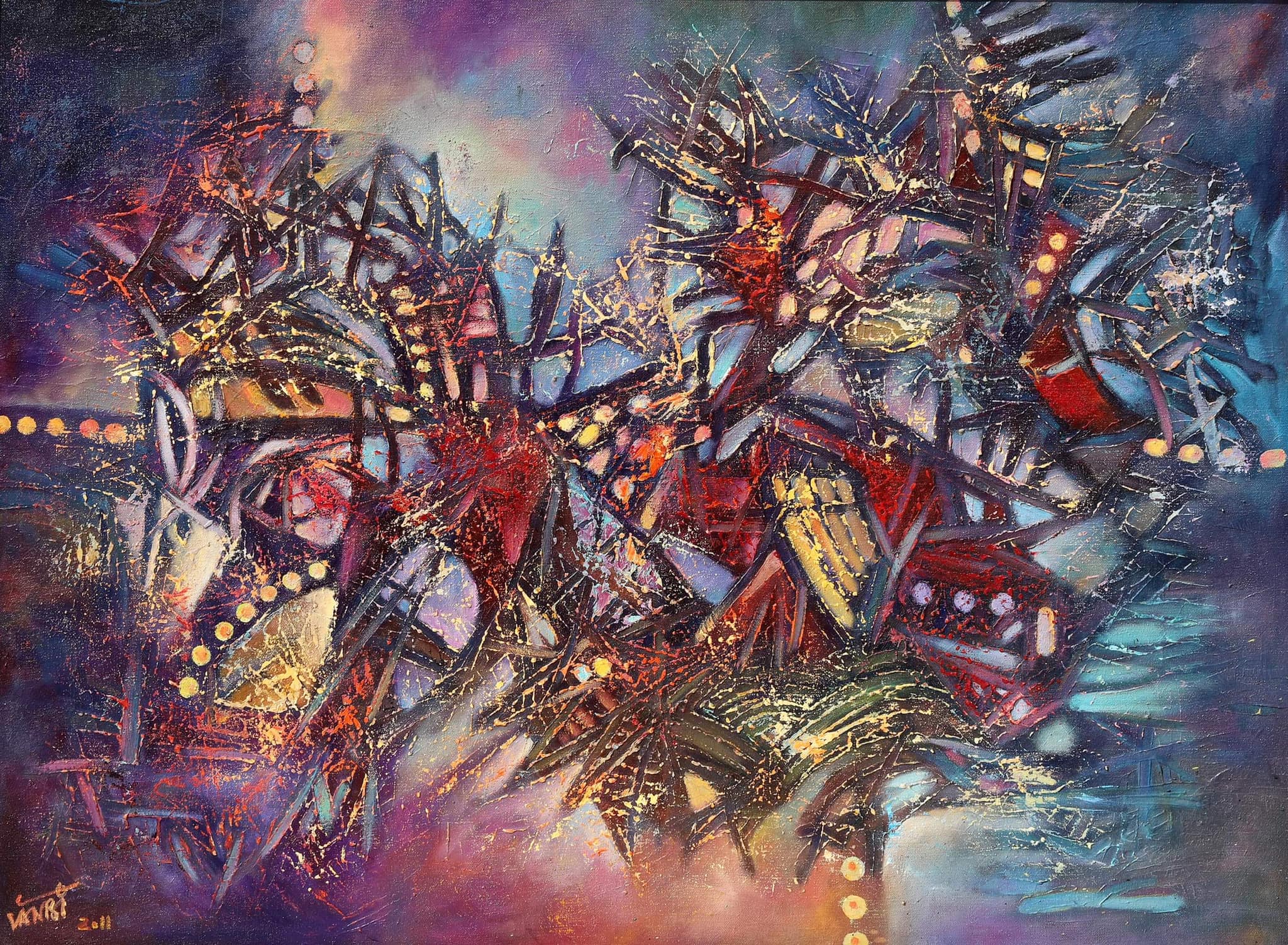 Trước khi đi qua những lớp nội tâm thú vị khác, không thể không bàn tới năng lượng âm ỉ quẫy đạp, thôi thúc bùng phát trong tranh Trần Văn Binh. Thao tác quẹt cọ ngang dọc một cách vô thức hay ý thức, trong gam màu nóng đậm đến rất đậm, thể hiện tính lửa ngông và mạnh mẽ của họa sĩ. Một điều thú vị là những “nhát cứa” này nổi hay hướng lên trên, thay vì chìm xuống dưới, thể hiện sự thôi thúc bủng nổ rất quyết liệt từ bên trong.