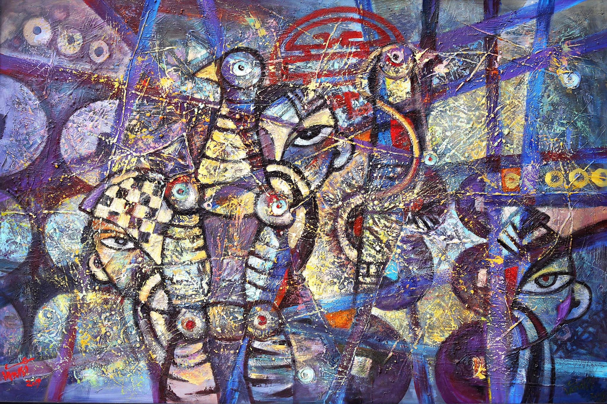 Thi thoảng, ta cũng thấy những khuôn mặt người, những thân phận chồng chéo, ngang dọc với nhau; hay những cuộc đối thoại không lời, khiến hồn tranh như thêm phần bí ẩn. “Nín bặt” hay kêu gào, thì rốt cuộc, dường như tất cả đều đang rất cần, rất đòi hỏi, rất khẩn thiết sự lắng nghe, bao dung và thấu hiểu. Và đó có lẽ là điều đúc kết khi lặng lại trước bộ tranh của Trần Văn Binh.