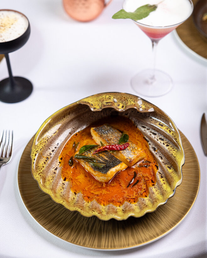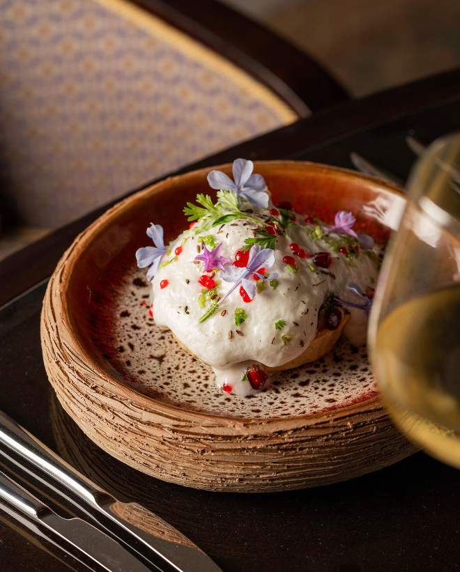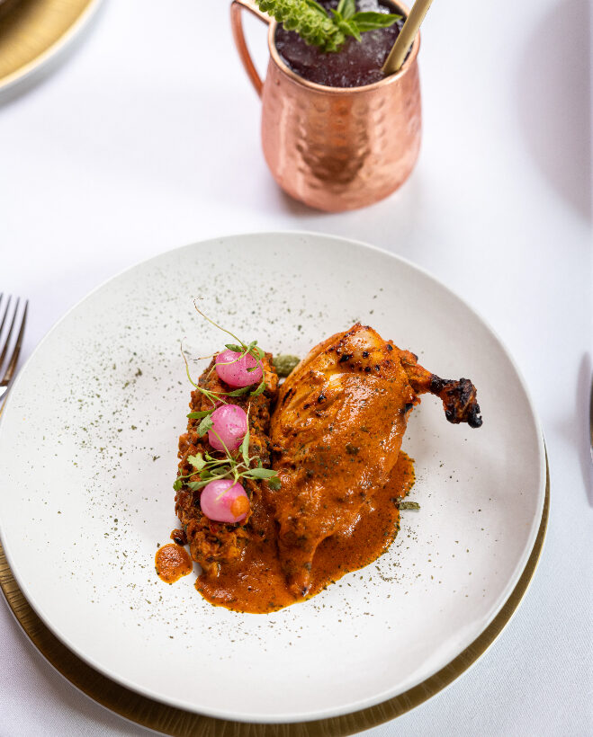 Bắt đầu với món khai vị Samosa Chaat, món ăn cổ điển được sáng tạo lại và đem đến sự bùng nổ về kết cấu và hương vị. Sự phối hợp hài hoà giữa samosa giòn tan, tương ớt thơm thơm và sữa chua béo ngậy thấm đẫm trong mỗi miếng cắn. Món ăn chính mang âm hưởng Ấn Độ đậm nét là Murgh Makhani (gà bơ), được ví như một kiệt tác với miếng gà mọng nước ngâm trong nước sốt cà chua mịn mượt. Hay Keema Pav, một món ăn dân dã được Đầu bếp Ghai chế biến từ những nguyên liệu đơn giản nhưng nâng tầm chúng thành một kiệt tác.