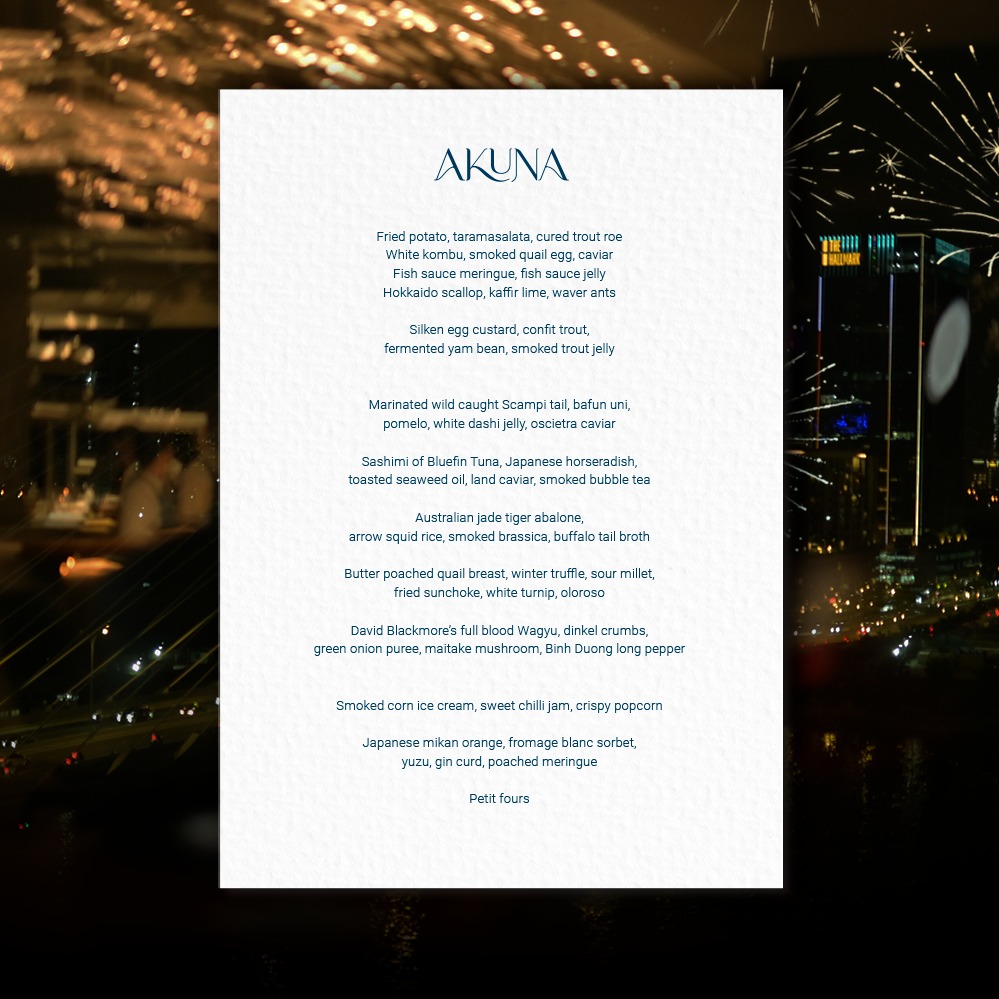 Nhìn lại một năm và đón chờ giờ phút chuyển giao thiêng liêng tại nhà hàng AKUNA với những nguyên liệu Việt Nam cùng triết lý sáng tạo “Không giới hạn”. Cùng thưởng thức bản giao hưởng vị giác dành riêng cho khoảnh khắc thiêng liêng nhất, đắm chìm trong những “nốt nhạc” trầm bổng kèm một ly Vintage Champagne hảo hạng, và sẵn sàng cho những bất ngờ thú vị được điểm xuyết, xen lẫn trong từng cung bậc trải nghiệm. Menu đã bao gồm 01 ly Vintage Champagne.