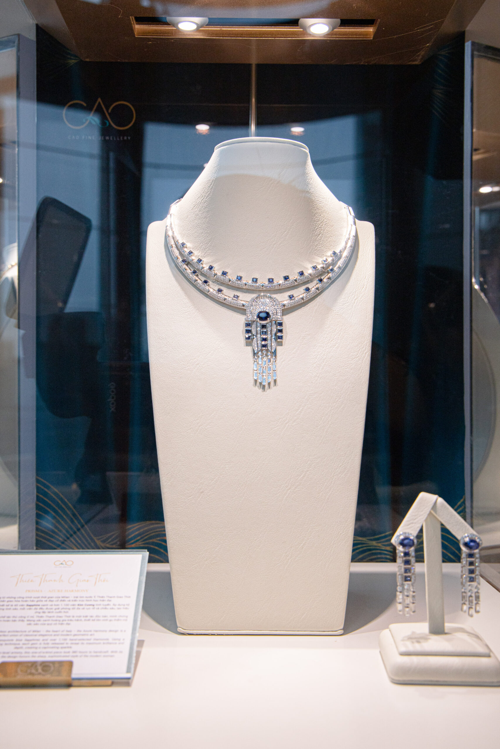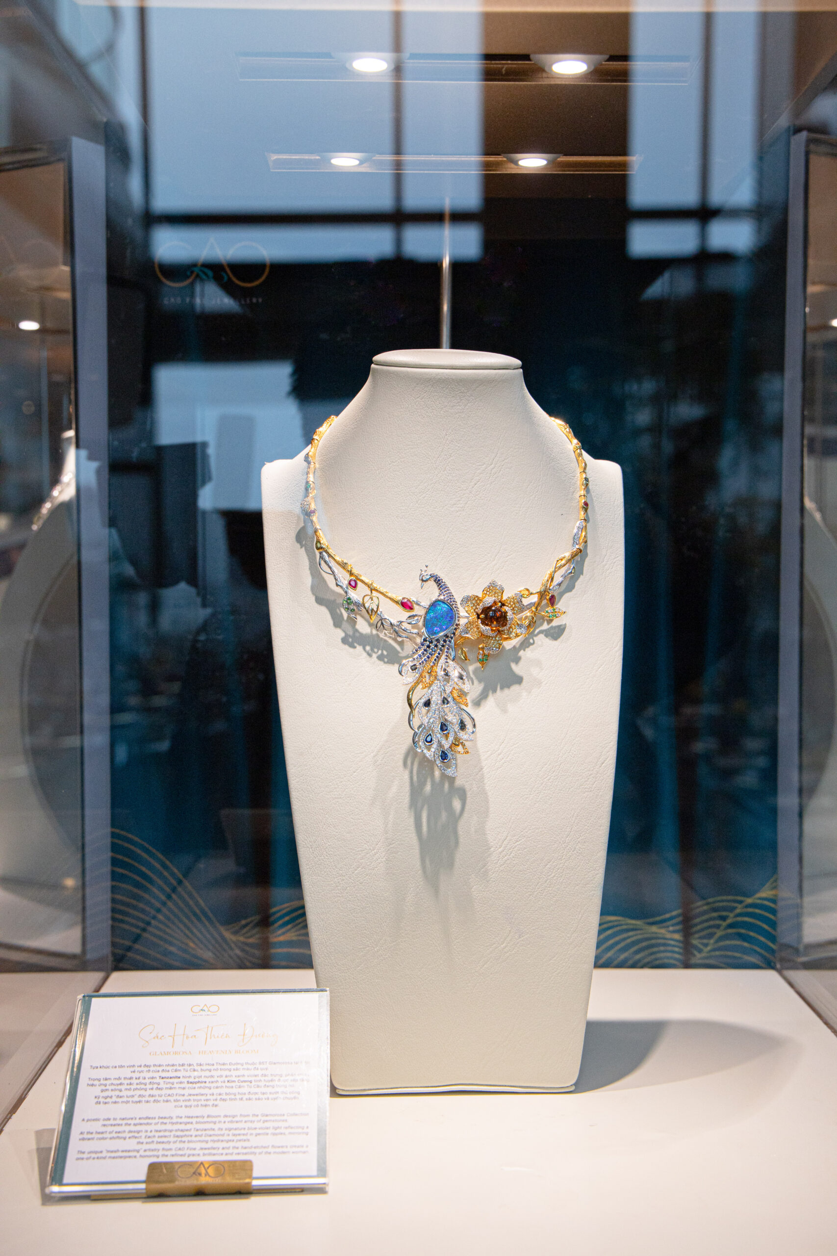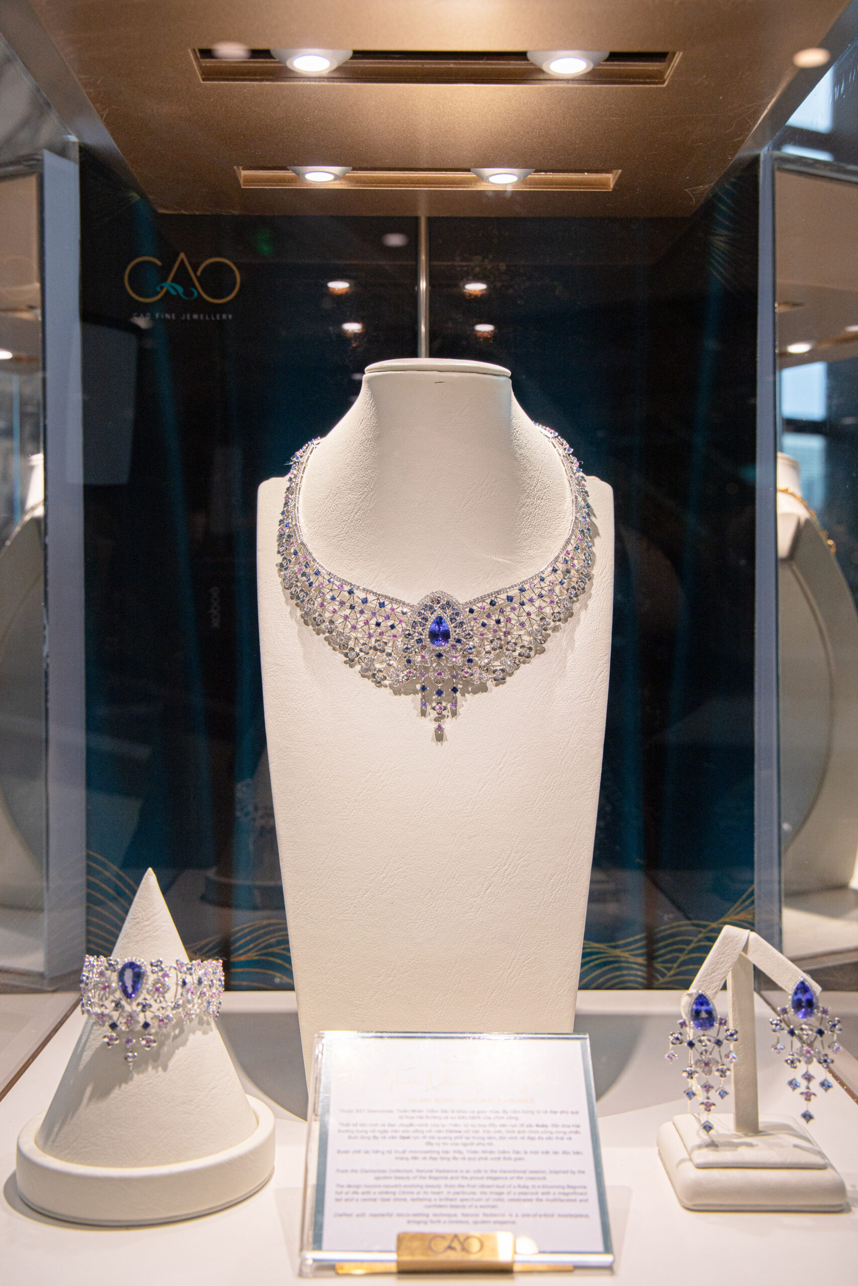 Trong không gian ấy, bộ sưu tập trang sức Legendary – Sắc Hoa Thiên Đường tinh tế và độc nhất từ CAO Fine Jewellery đã xuất hiện như một tuyệt tác hoàn hảo làm tròn vẻ đẹp của đêm tiệc. Là sự kết tinh của ngôn ngữ thiết kế độc bản và tay nghề đỉnh cao của các nghệ nhân, bộ sưu tập không chỉ là món trang sức mà còn là lời ngợi ca dành cho vẻ đẹp của người phụ nữ. Tâm điểm kiệt tác là viên Tanzanite xanh violet được ôm trọn bởi Sapphire và Kim Cương tấm, tạo hiệu ứng chuyển sắc và phản chiếu vẻ đẹp linh hoạt đầy tinh xảo.